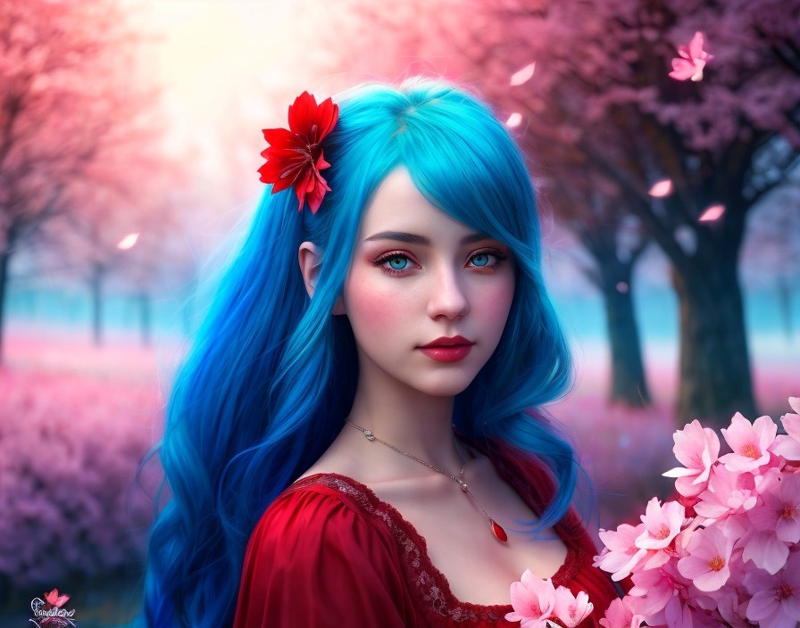 A young woman with blue hair and red eyes. She stands between cherry trees. And has a dress on.