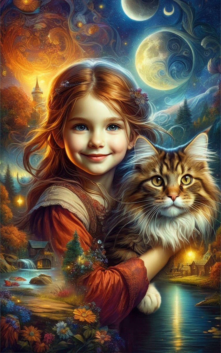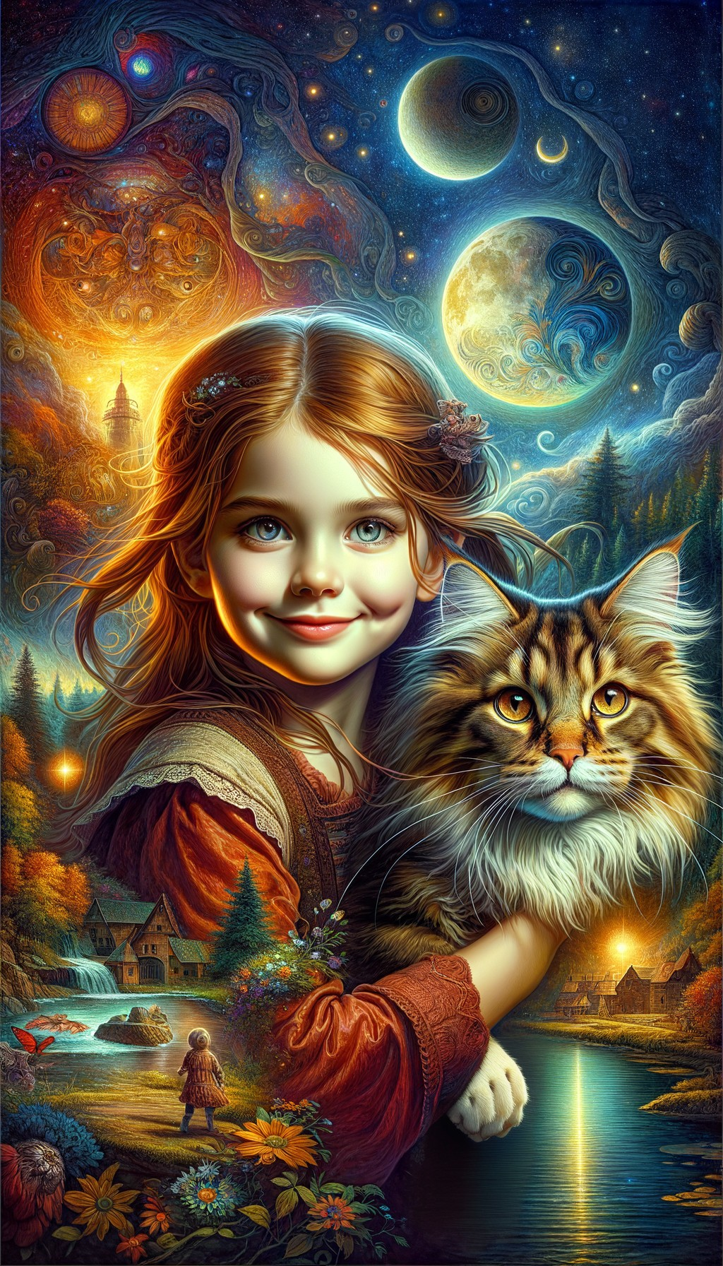 A girl with auburn hair smiles, holding a large cat, against a fantasy backdrop with a moonlit sky, swirling clouds, and a quaint village.