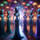 A group of elegantly-dressed aliens stands in a vibrant, cosmic setting, holding colorful drinks. The atmosphere is festive, with glowing chandeliers and a starry backdrop.