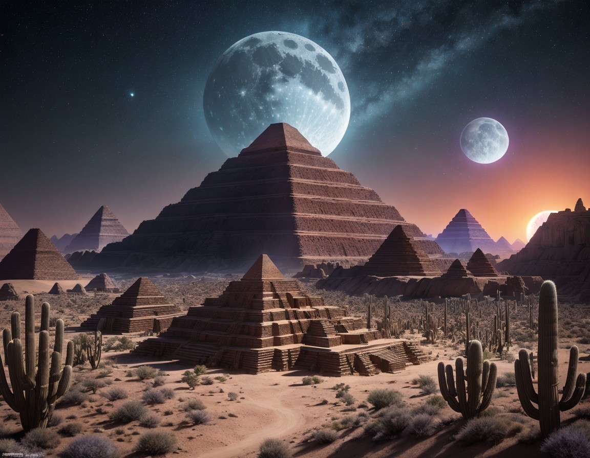 Prompt: Intricate 4k visionary art of a dark desert landscape at night with an alien spacecraft/UFO above an ancient pyramid temple. Cacti and giant monolithic crystals adorn the environment. intricate geometric patterns shine from a full moon. Sacred geometry in the moonbeams and starlight. DMT visuals, DMT realm, psytrance artwork, epic shamanic dmt art, sacred geometry, fantasy art, hyper detailed, astral, galactic, cosmic, space, intricate, detailed, landscape, metaphysical, Cameron Gray