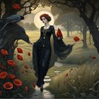 In a dimly lit, vintage bathroom, two elegantly dressed figures interact. One wears a sleek black gown, while the other, in lingerie, stands beside a vintage bathtub, creating an intimate atmosphere.