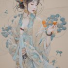 A young woman in a flowing, intricately patterned kimono holds colorful mushrooms, adorned with vibrant flowers in her hair, set against a soft, neutral background. The whimsical design exudes elegance.
