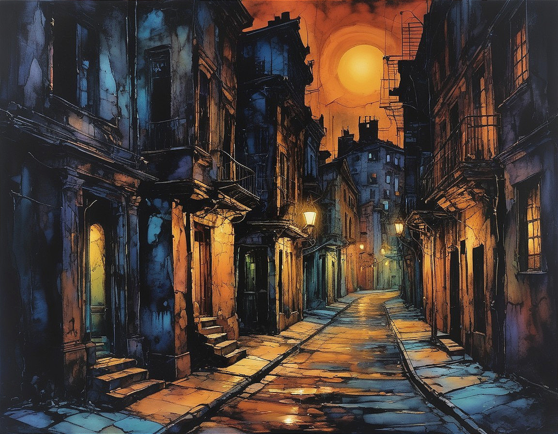 An artful portrayal of an old, empty street at night with warm hues from a full moon above, bathing the scene in a mysterious, calm glow.