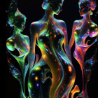 Three majestic seahorses stand tall, glowing with vibrant colors in a dark background. Their intricate designs showcase flowing tails and ornate details, creating a fantastical underwater scene.
