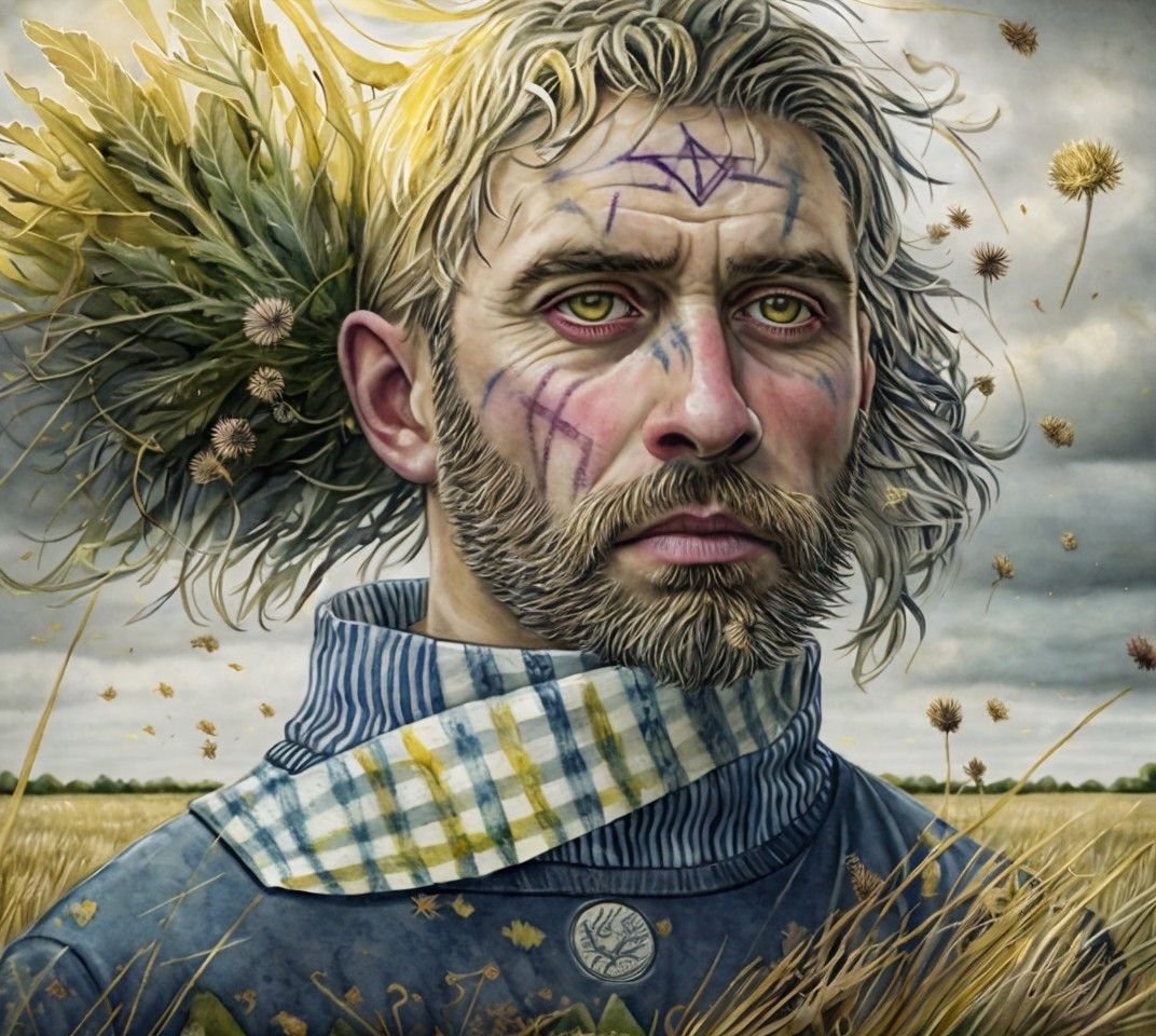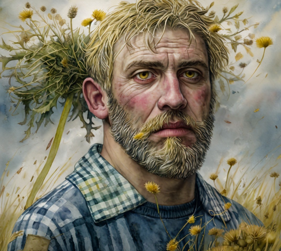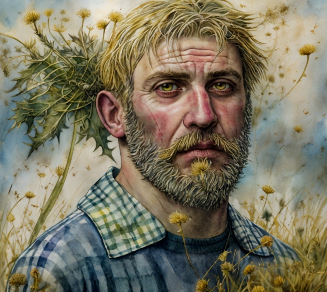 A surreal watercolor and ink portrait of a rugged figure among thistles, his yellow eyes reflecting both struggle and spirit. Blending the man with Scotland’s emblematic flora and rugby’s heritage, the scene moves between myth and reality, between personal identity and cultural field.