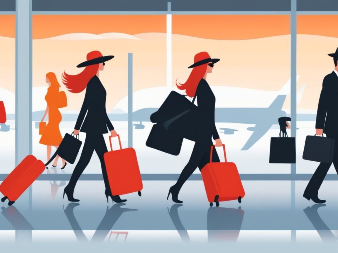 A stylish woman in a black suit and hat walks through an airport, pulling luggage. Planes are visible in the background, capturing a vibrant travel scene.