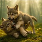 Two playful wolf pups are frolicking in a lush forest, surrounded by ferns and mushrooms. Soft sunlight filters through the trees, illuminating their furry coats and the serene natural setting.