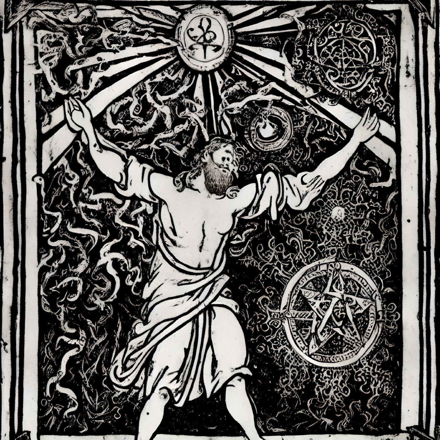 Monochrome illustration of robed figure reaching towards radiant sun with symbolic elements and ornate patterns.