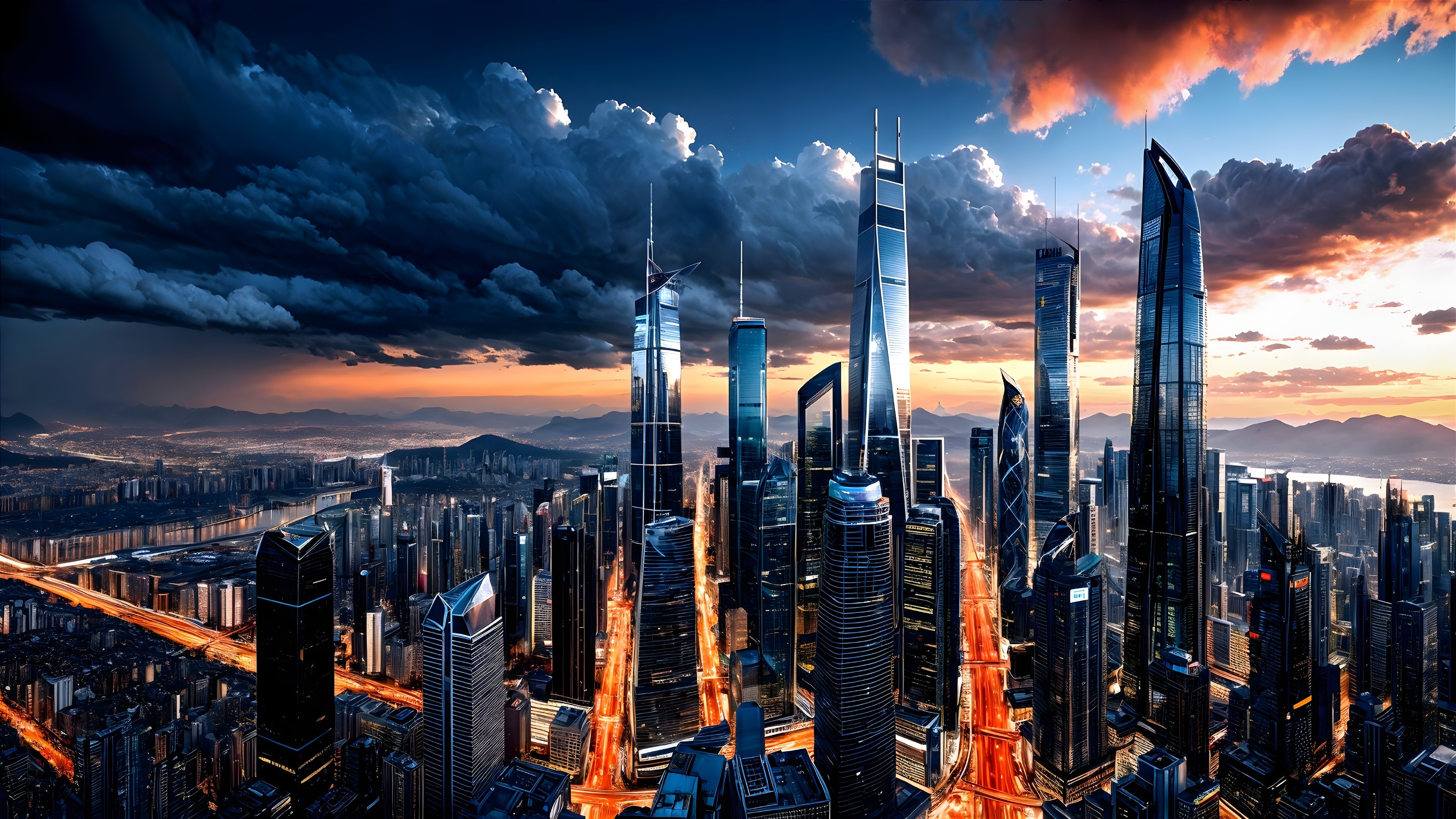 A breathtaking panoramic cityscape showcases towering skyscrapers and bustling streets, framed by distant mountains and dramatic clouds. The vibrant colors and cinematic lighting create a hyper-realistic, elegant masterpiece.