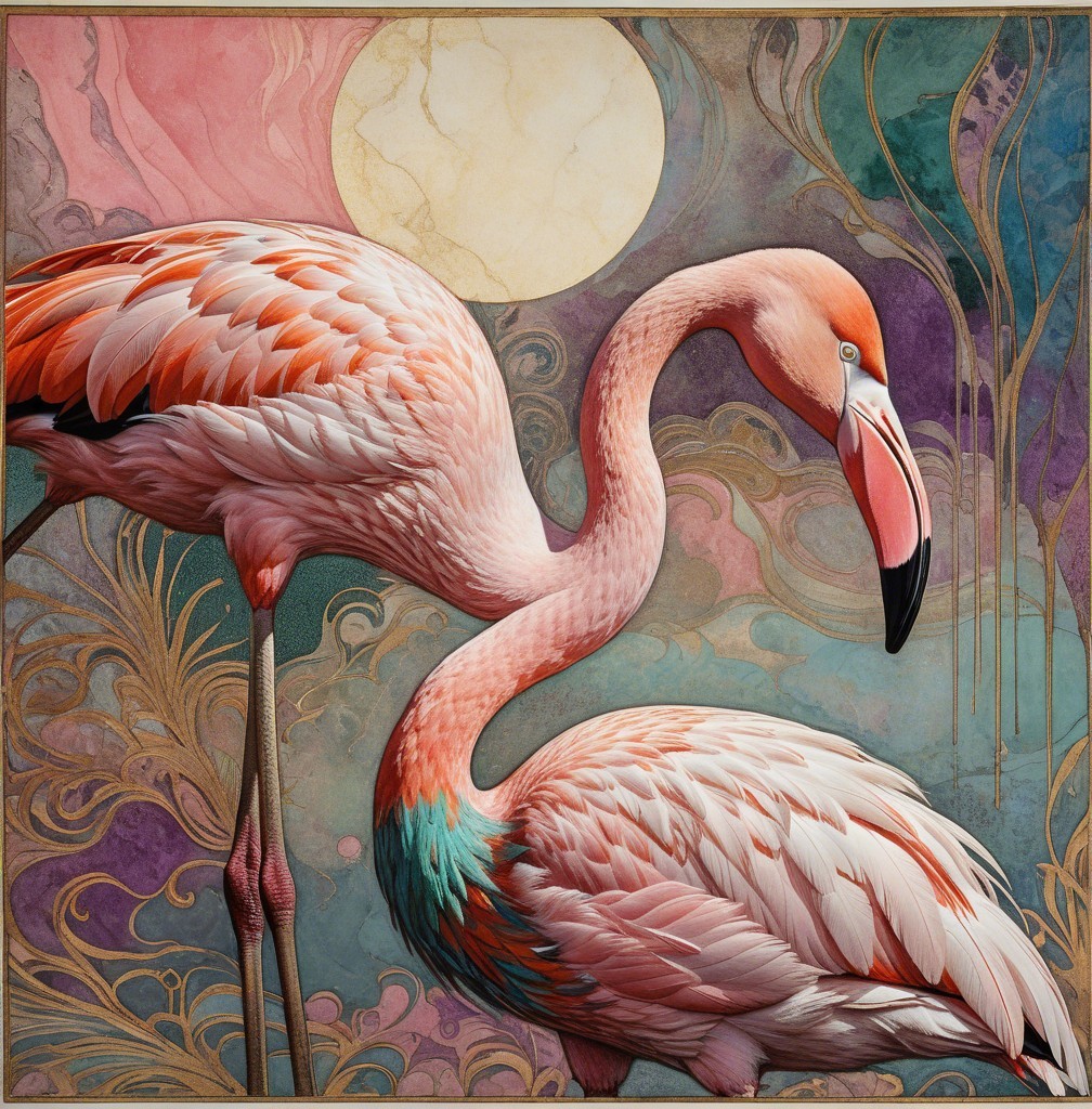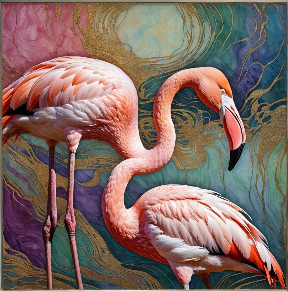 A vibrant artwork featuring a flamingo against a swirling backdrop of rich purples, blues, and golds, showcasing the beauty of nature through bold colors and dynamic patterns.