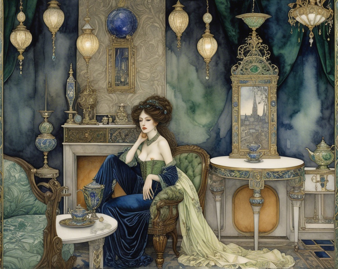A stunning woman lounges in an opulent room, adorned in an elegant green gown with intricate designs. Soft light filters through ornate windows, highlighting her beauty and the luxurious setting.