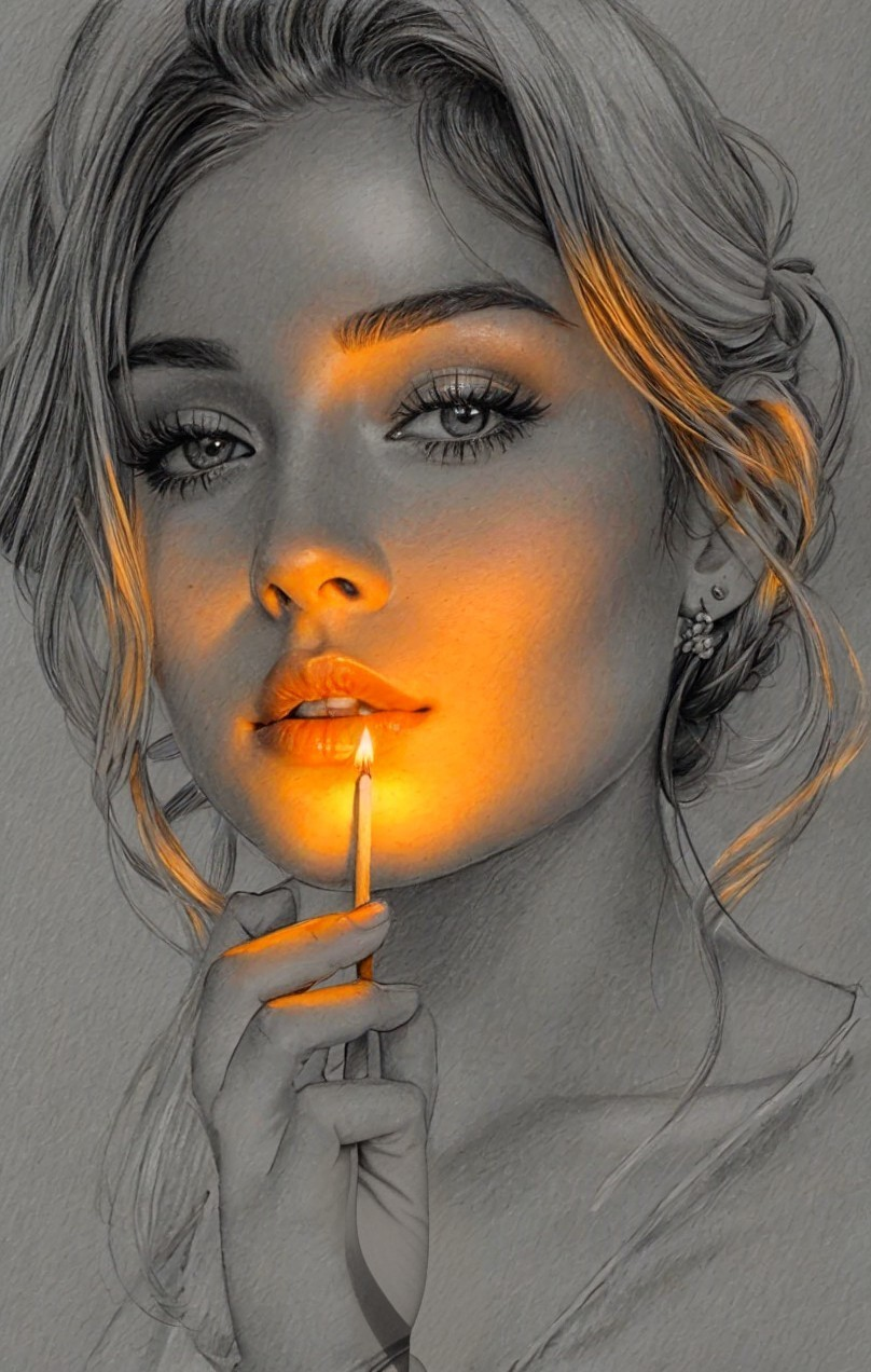 Black and white pencil sketch of a beautiful woman holding single match in front her face where the soft yellow light illuminates her beautiful features. she has her hair tied up in a messy bun with some strands of hair falling in her face.