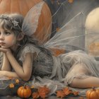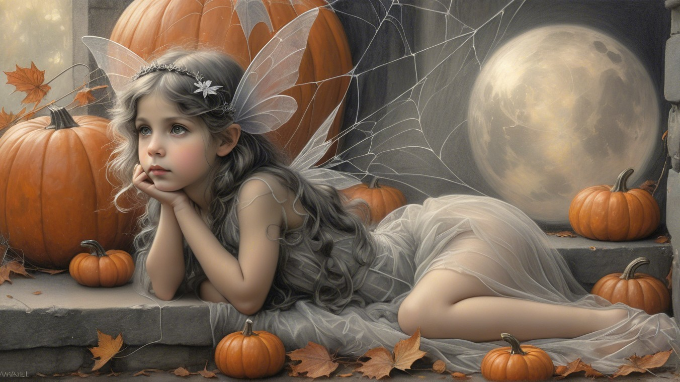 A dreamy fairy girl with delicate wings rests on a stone ledge surrounded by autumn leaves and pumpkins, gazing thoughtfully at a full moon in a mystical scene.