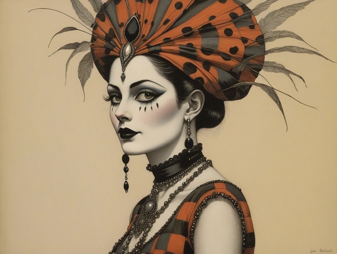 The image features a striking portrait of a woman with an ornate headpiece and jewelry, showcasing intricate patterns and a blend of colors, creating an elegant and captivating appearance.