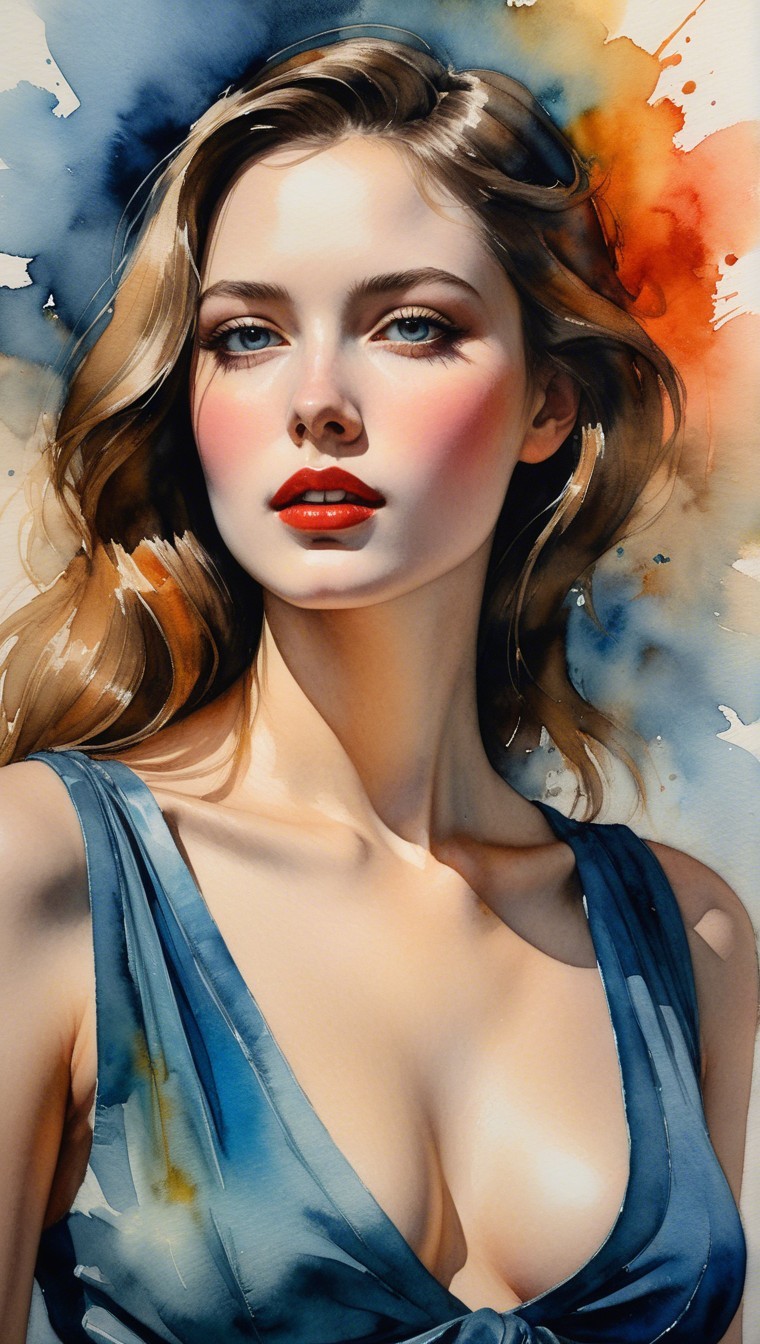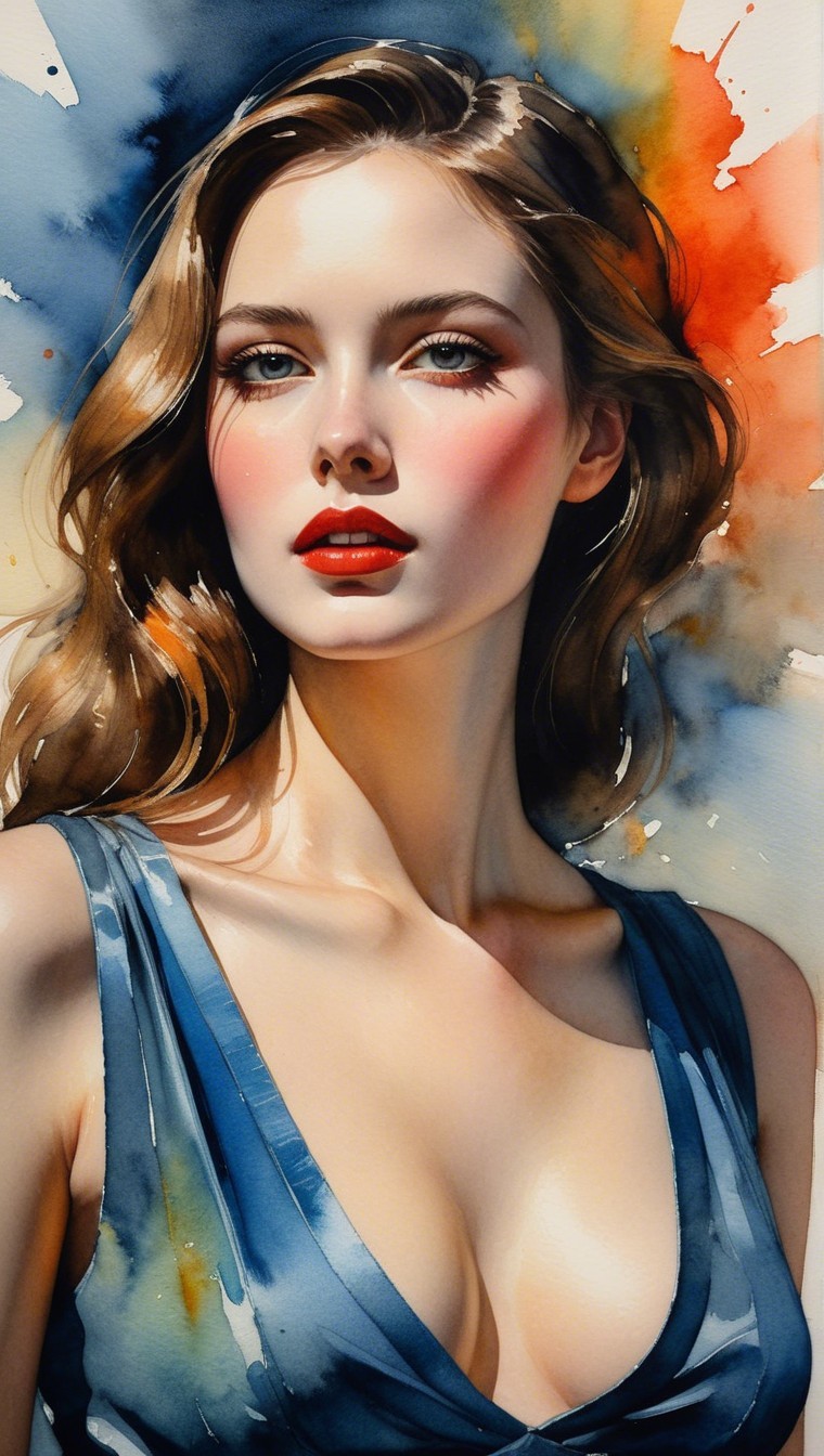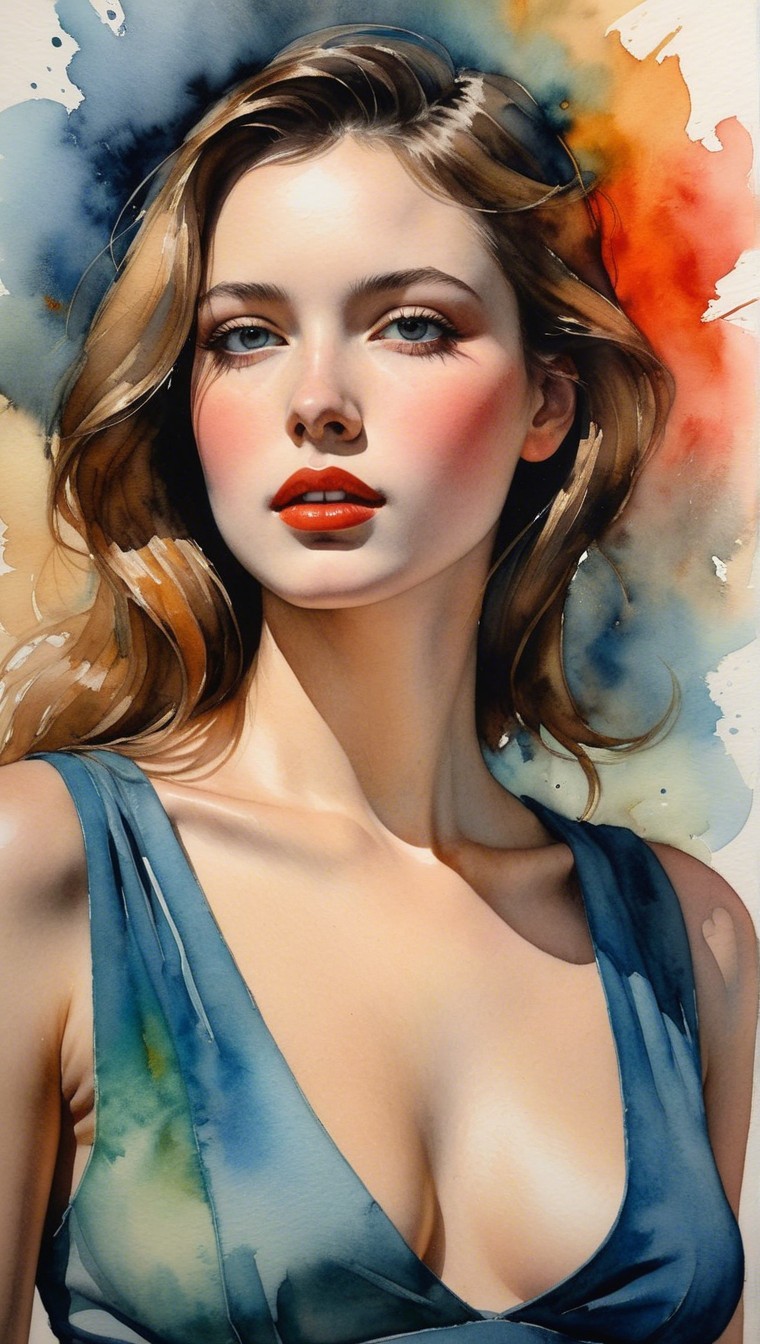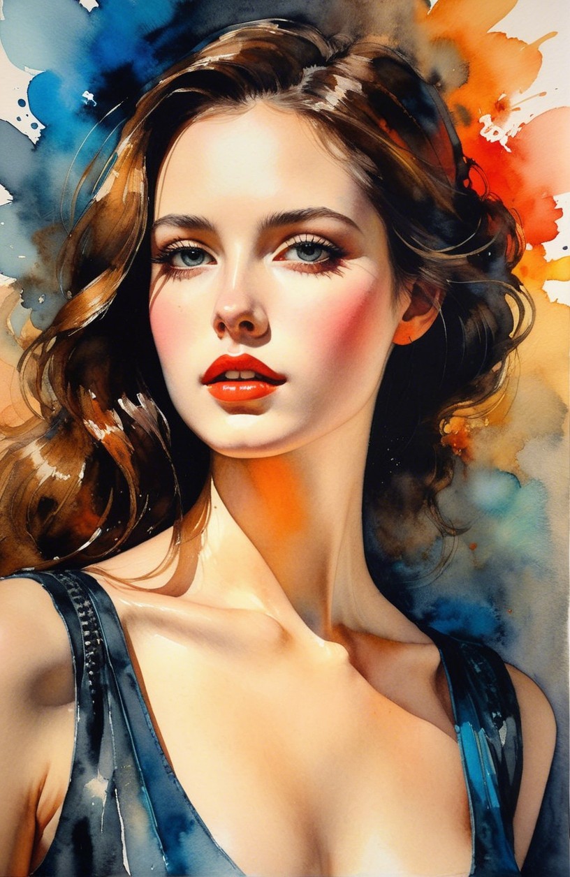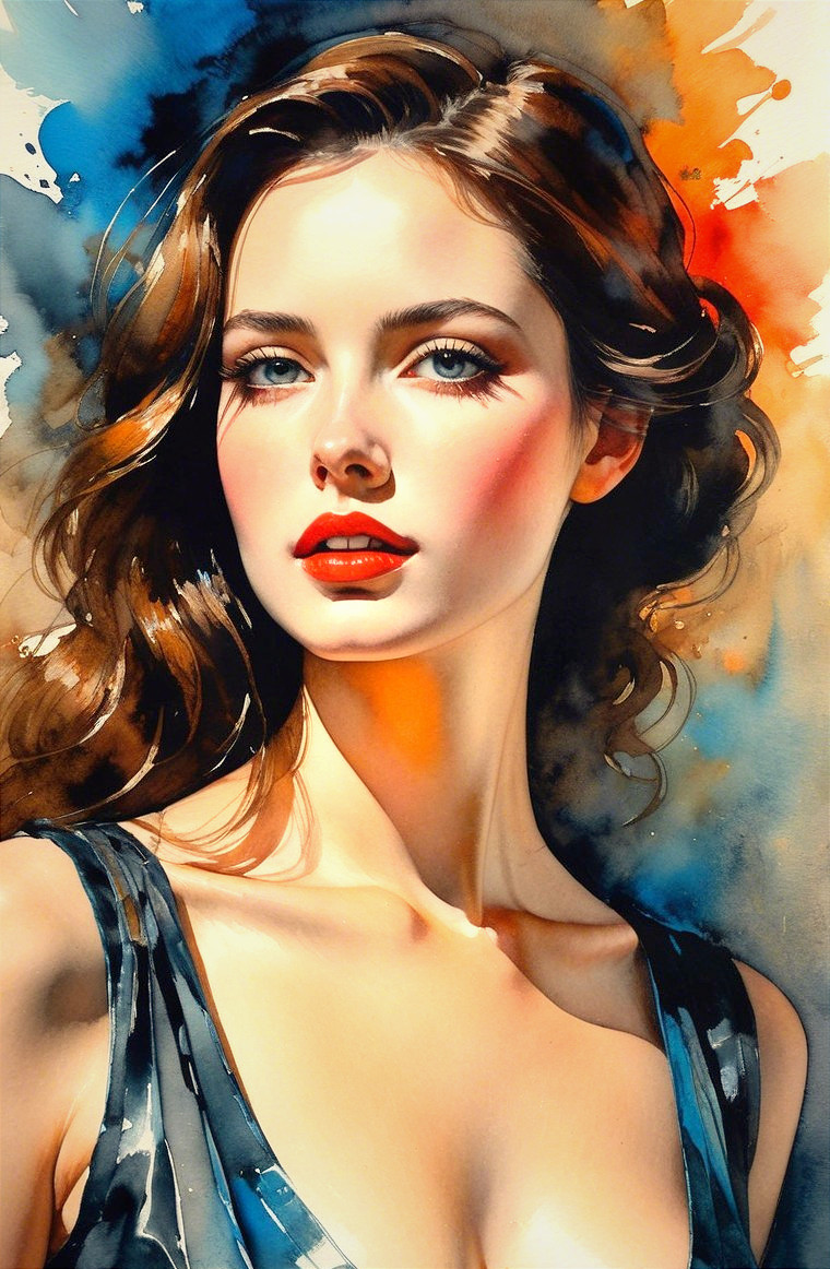 A stunning watercolor portrait of a young woman with long, wavy brown hair. She has captivating eyes, full lips, and a graceful posture, set against a vibrant splash of colors.