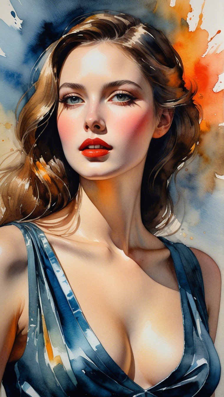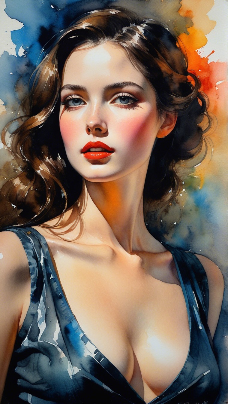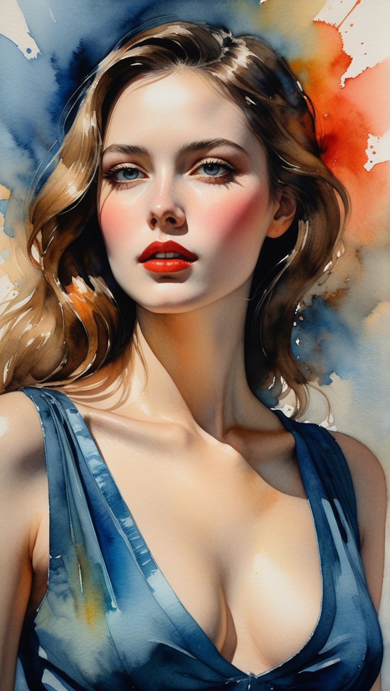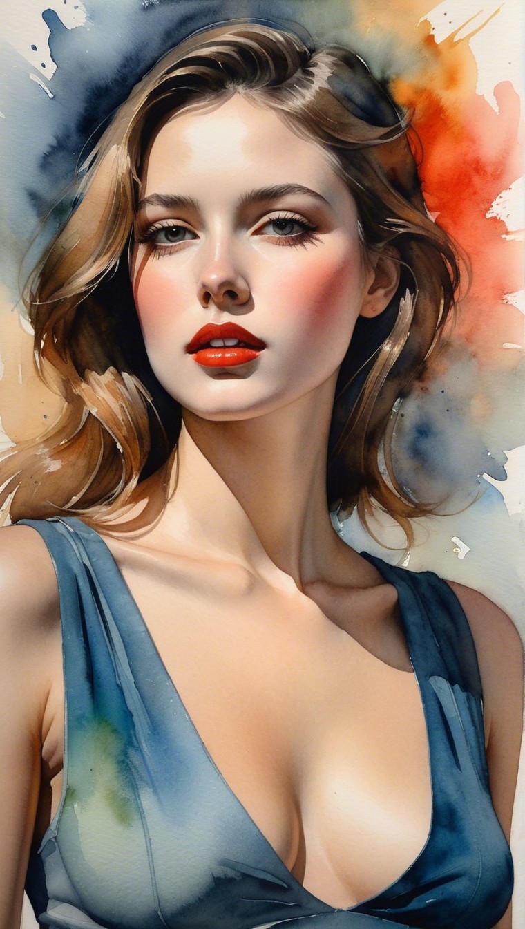 A stunning watercolor portrait of a young woman with long, wavy brown hair. She has captivating eyes, full lips, and a graceful posture, set against a vibrant splash of colors.