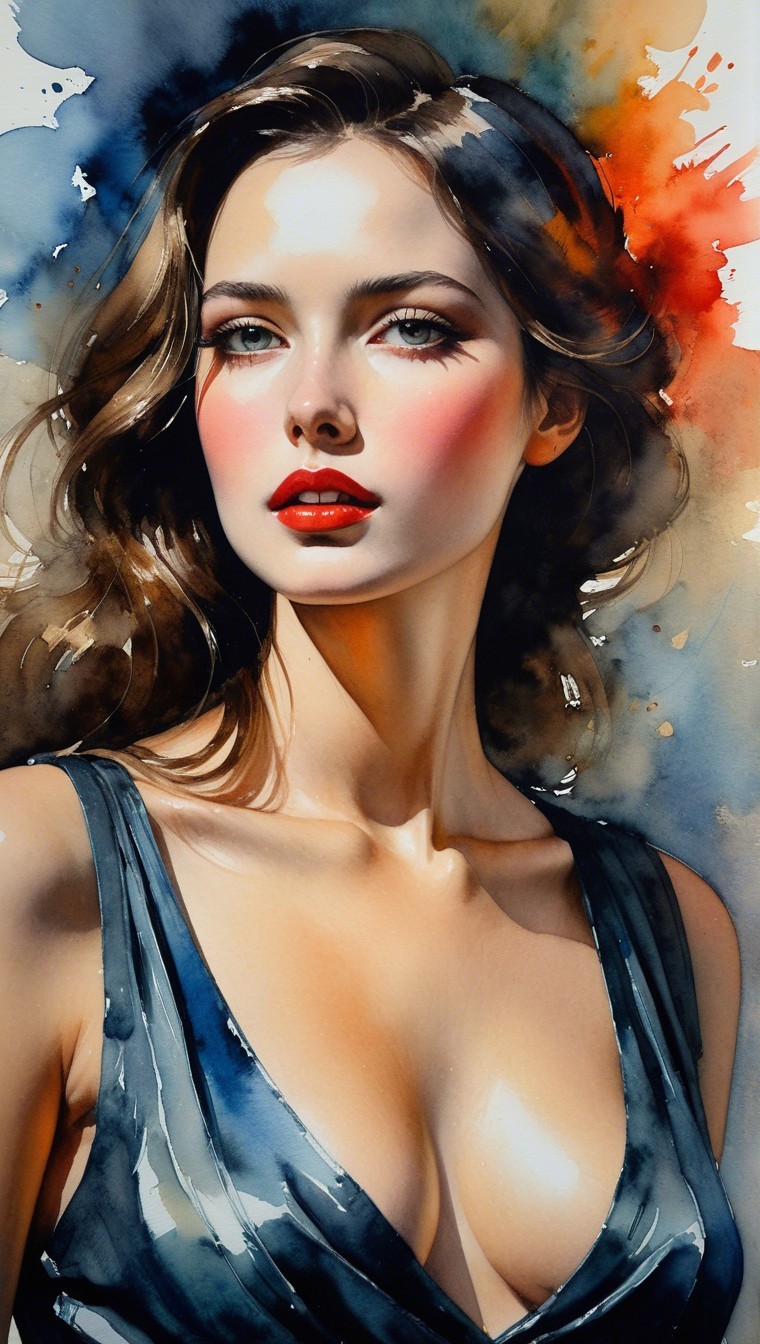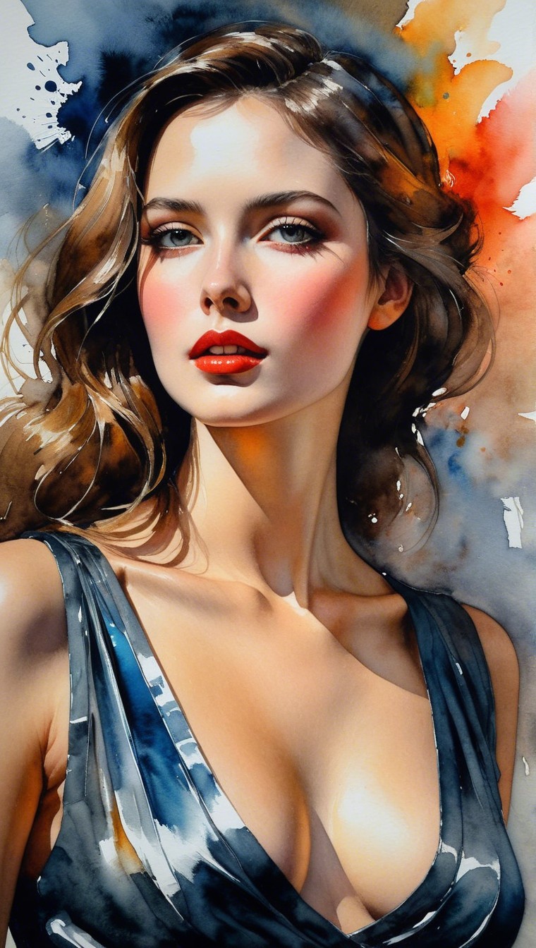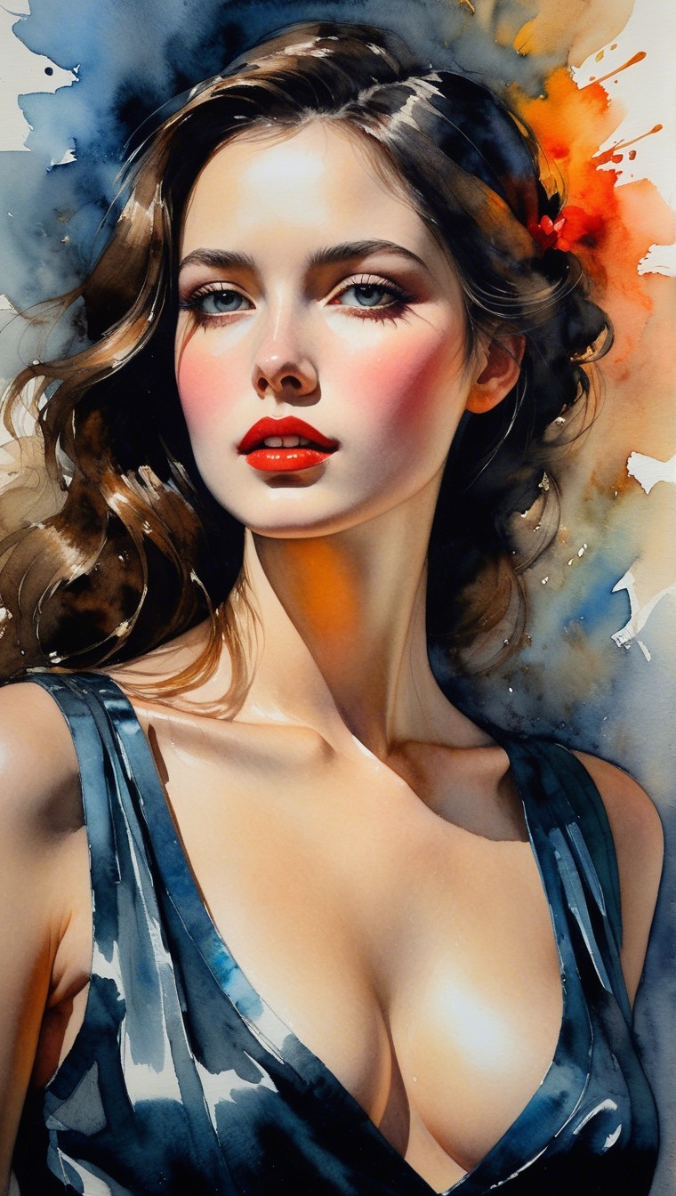 Prompt: Vibrant and expressive watercolor portrait by Robert Henri and Esao Andrews. Thick palette knife textures, black ink brushwork, fond attitude, enlightened, soft coloring, embedded shimmer, vivid watercolor accents, expressive brushwork, fabric details, emotional depth, crackles, contraptions, visible catenaries, stylized gothic elegance, glowing light effects, surreal atmosphere, large impasto brushstrokes, palette knife technique, very thick layer of paint, post-avantgarde style, raytraced shadows, full-fledged excessive forms, high-resolution, intricate details, starfleet-blue, grey- black, deep coloring, purple and lilac gradients, merged styles of Renny Tait and William Turner's luminism, plasticity 1.6, dynamic lighting effects, ambient occlusion by Ho Baron, lighting by Ed Paschke, wavery texture, pellucid details, juminocore elements, grunge aesthetic, fusion art, pastel coloring, shadow mapping 1.3, sensually abstracted, with fluid lines and skin-toned gradients engraving, stencil-style etching, warm-toned upper body portrait, featuring detailed and intricate line art with micro-pen lineage. The artwork showcases fine and stacked lines with a dripping paint effect, creating a melting and dissolving appearance into streaks, brightness 1.3, flattened vector brushstrokes.