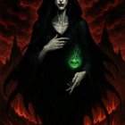 Prompt: Carmen Dell' Orifice/Julie Harris/J.K. Rowling face, beckons with a bony white pointing hand to a small magic vial of glowing green potion, beneath a dark red and black cloudy sky with fiery black mountains a very tall beautiful slender pallid gaunt woman with lovely long drawn out face, thin red lips, and big gaunt cheekbones, wrapped completely in a black robe with hood that half obscures her face in shadow, she floats moving to viewer above across a lake of lava,