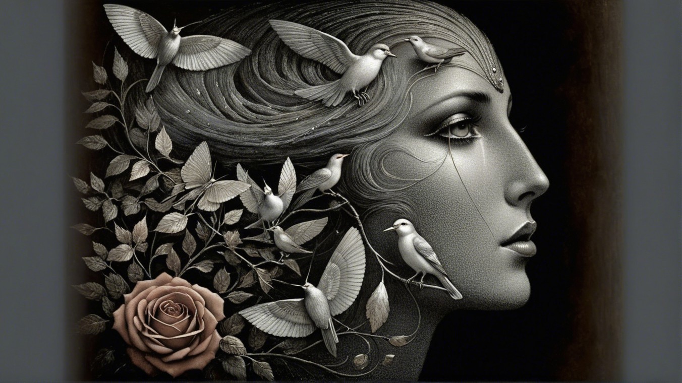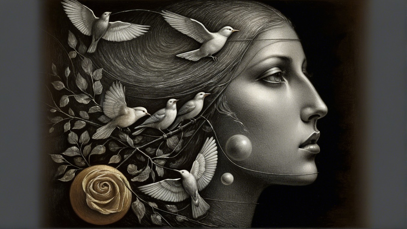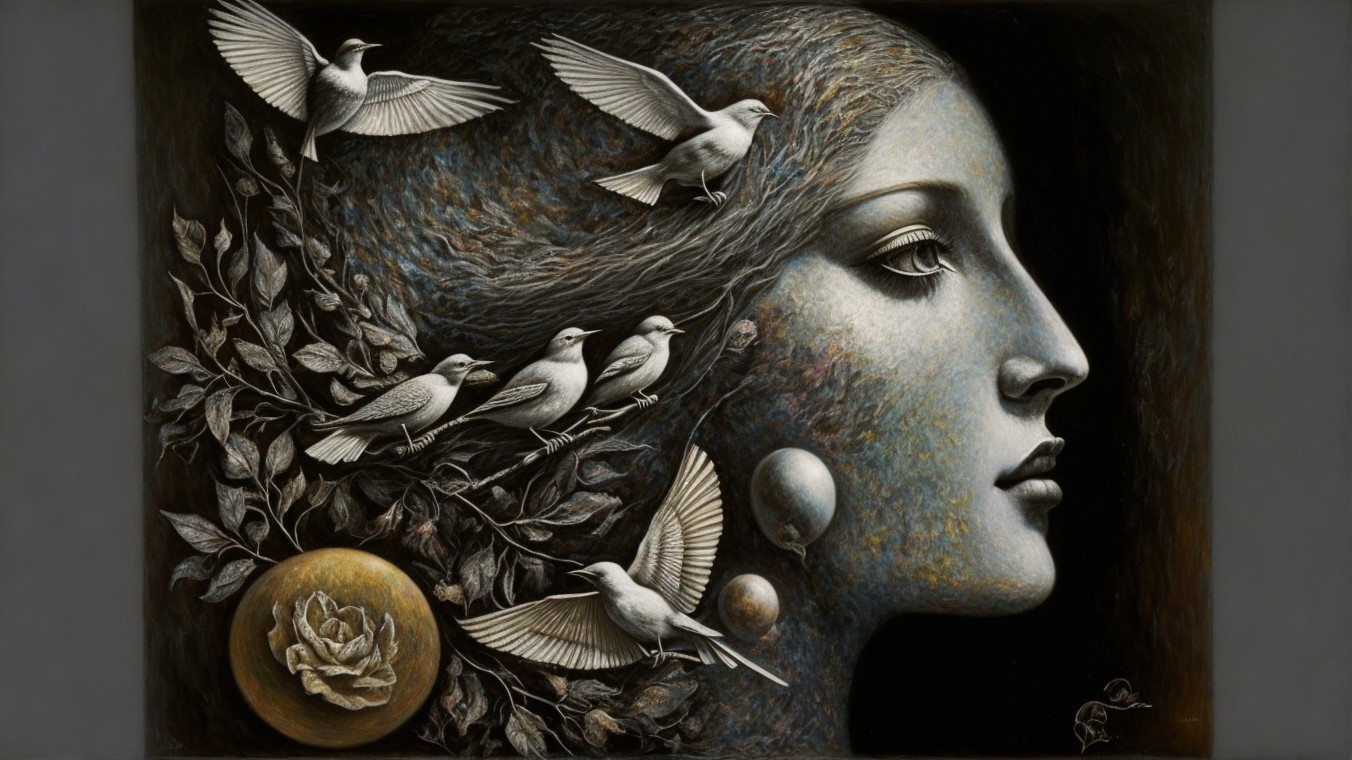 The image features a serene profile of a woman against a dark background, adorned with flying birds and a glowing orb, symbolizing freedom and connection between nature and humanity.