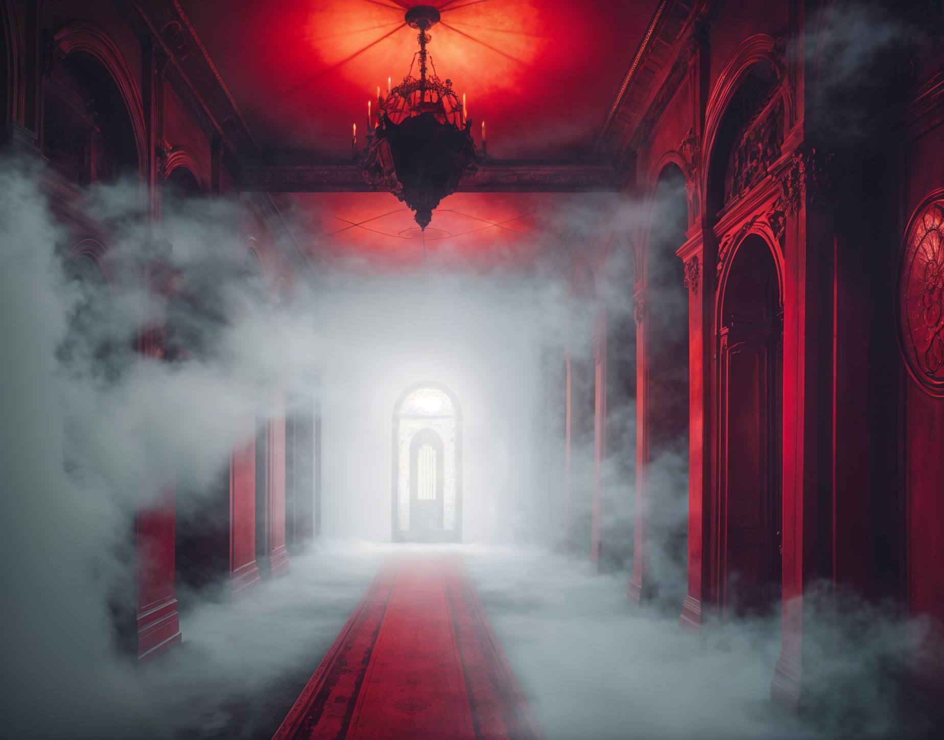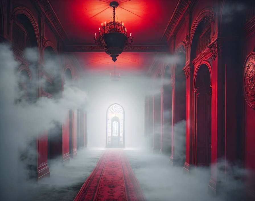 A dimly lit corridor bathed in red light, with fog swirling along a plush red carpet. An ornate chandelier hangs above, leading to a mysterious, glowing doorway at the end.