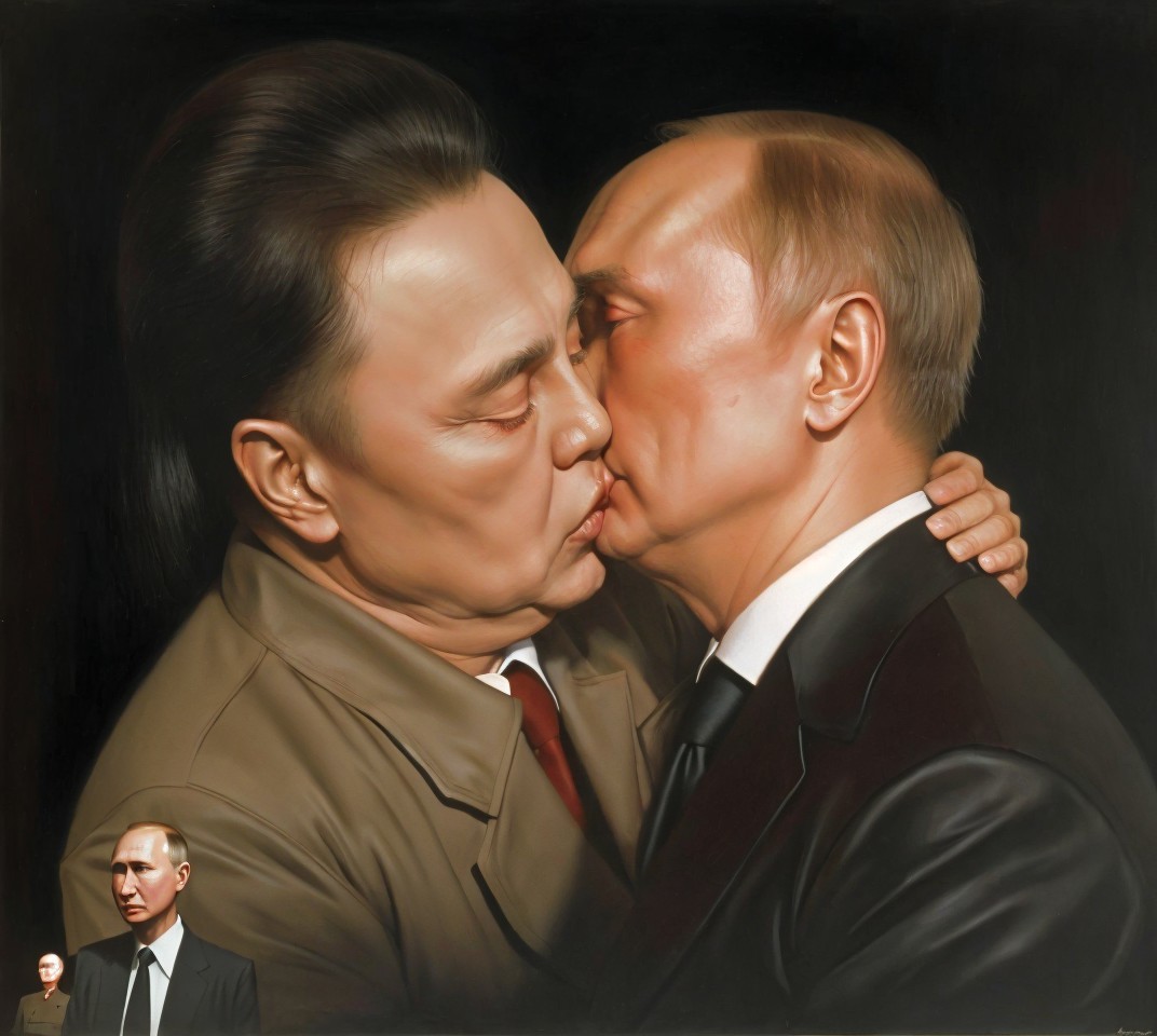 Two women with similar features in profile touching cheeks against a dark background.