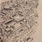 An aerial view watercolor painting of a large, ancient Mediterranean city with numerous buildings clustered closely together, a large amphitheater, multiple classical columned temples, and other ruins. The architecture features various shades of brown, tan, and terracotta for the rooftops and walls. Based on a drawing by J. Knothe in a book "Art of Building". 01.2026