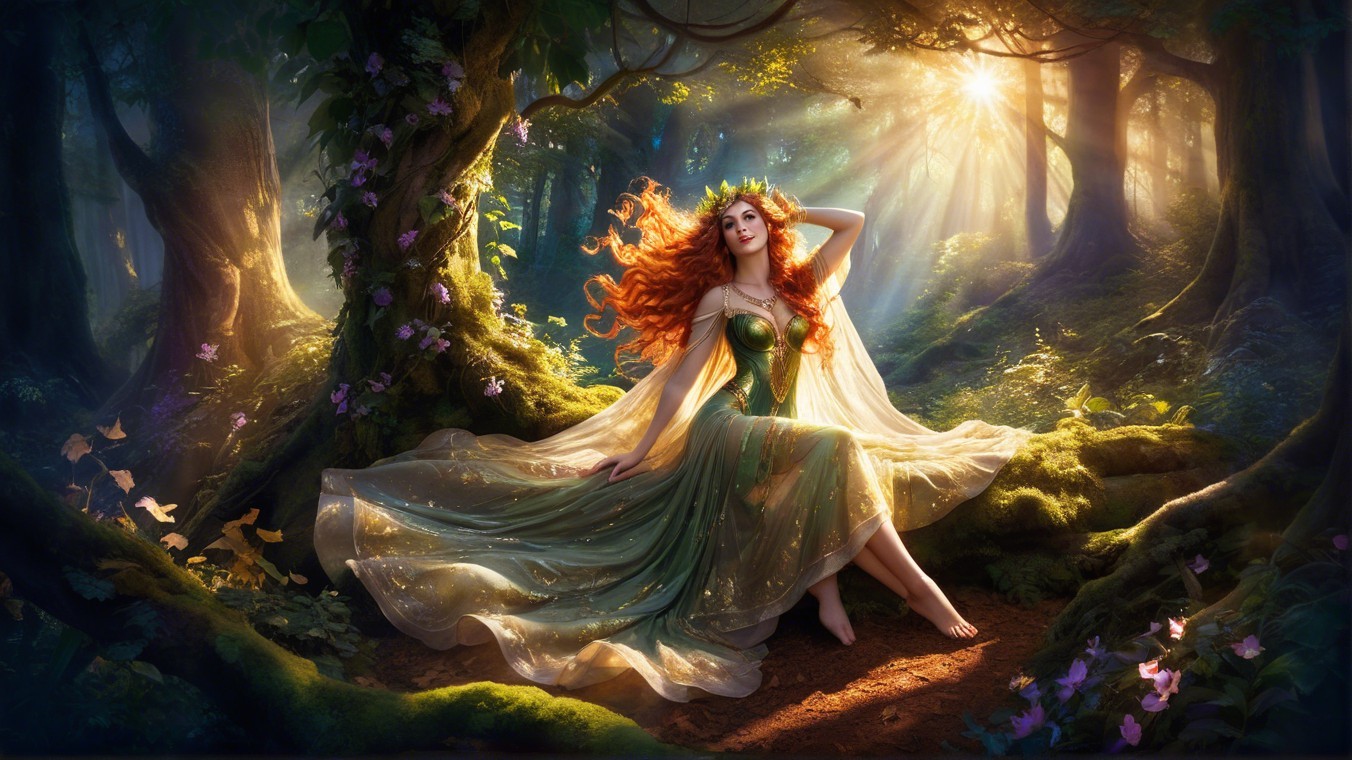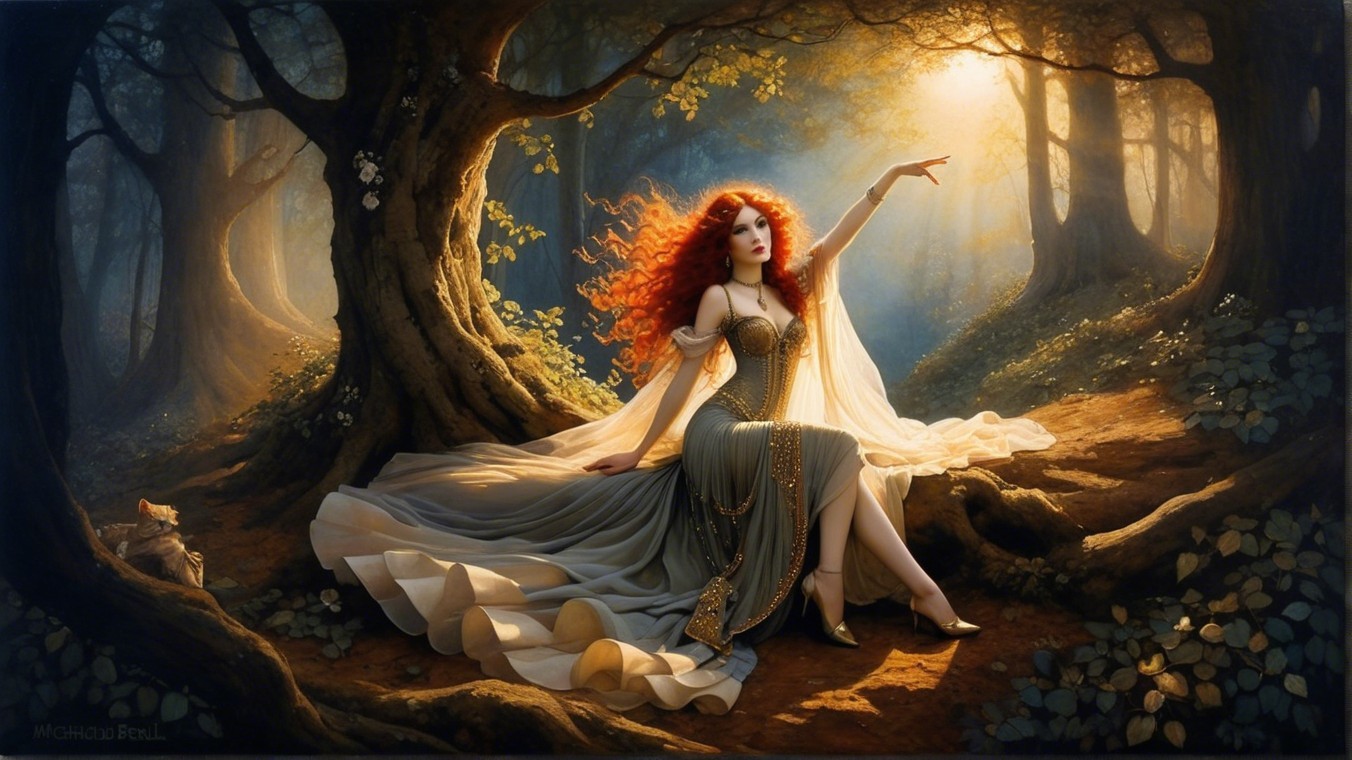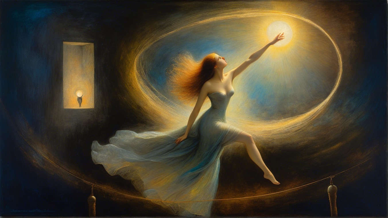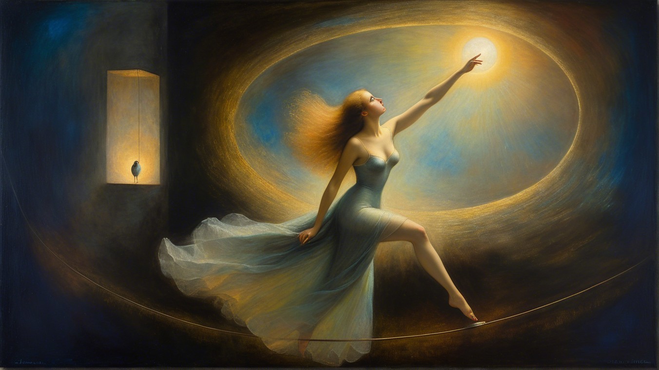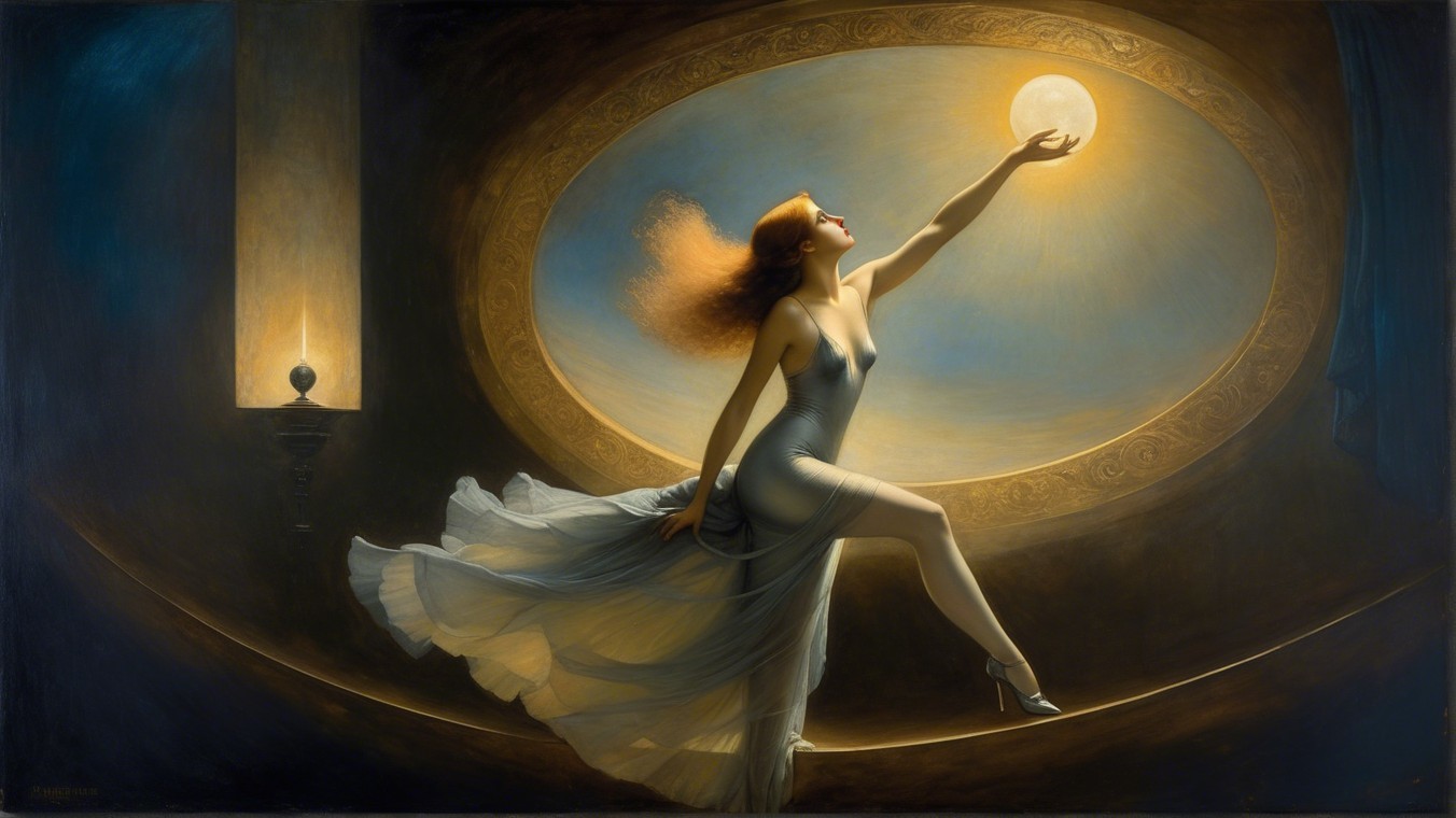 A serene woman in a flowing white dress gazes out a large oval window, illuminated by soft light. Beside her sits a fox, adding a touch of nature to the tranquil, dreamy scene.