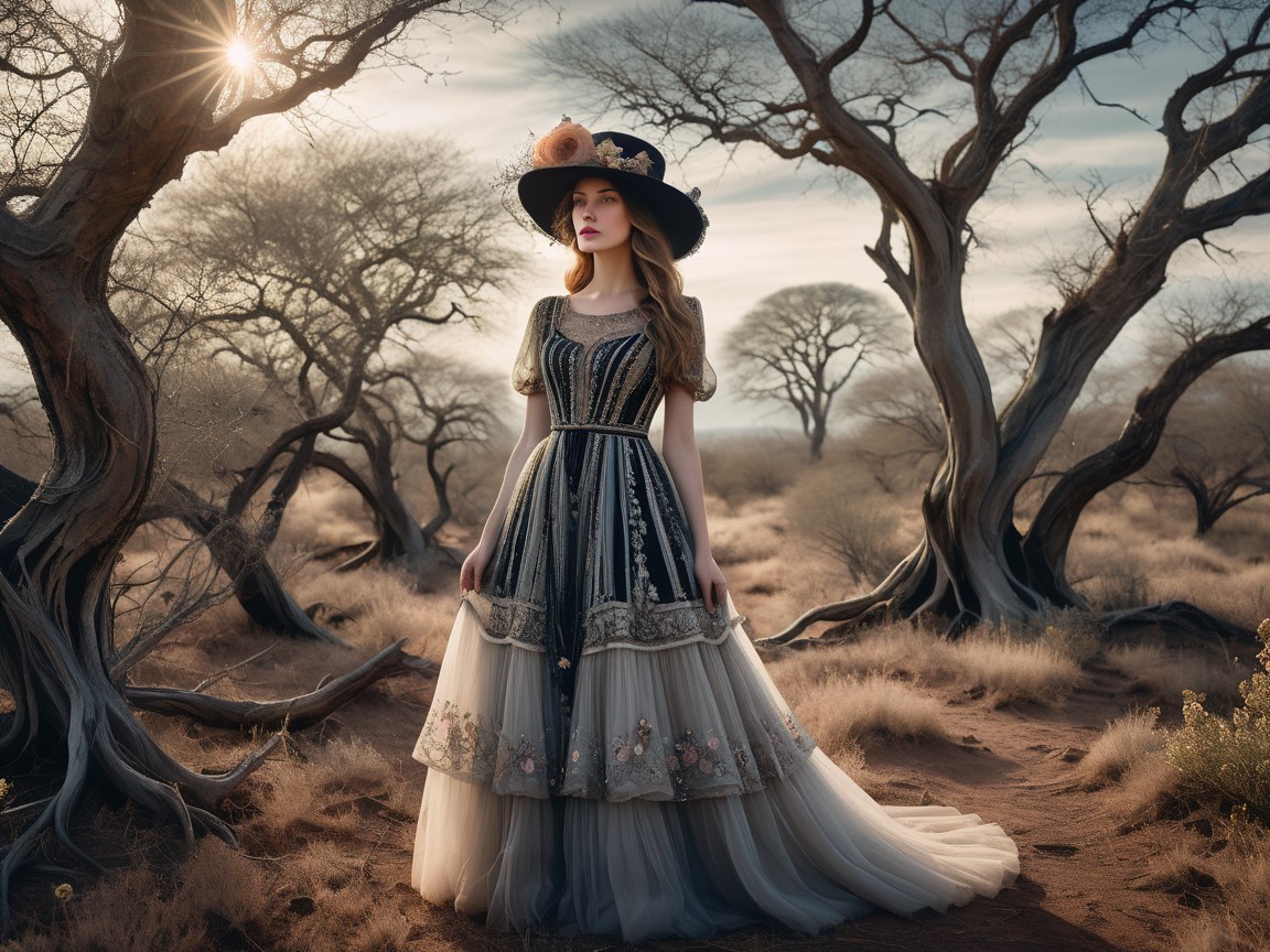 Prompt: Girl in a flowing, intricately patterned vintage dress with layers of tulle, and an ornate hat adorned with fresh flowers, delicate ribbons, and a sprinkle of subtle, shimmering dust, stands solitary amidst twisted, gnarled trees in a barren, mystical landscape, with a moody, gradient sky evoking an aura of mystery and solitude, reminiscent of Salvador Dalí's paradoxical realism, Henri Rousseau's naive, dreamlike quality, and the rich textures, vivid colors of old-world, high-resolution concept art, inviting the viewer to step into a surreal, 8k world of wonder.