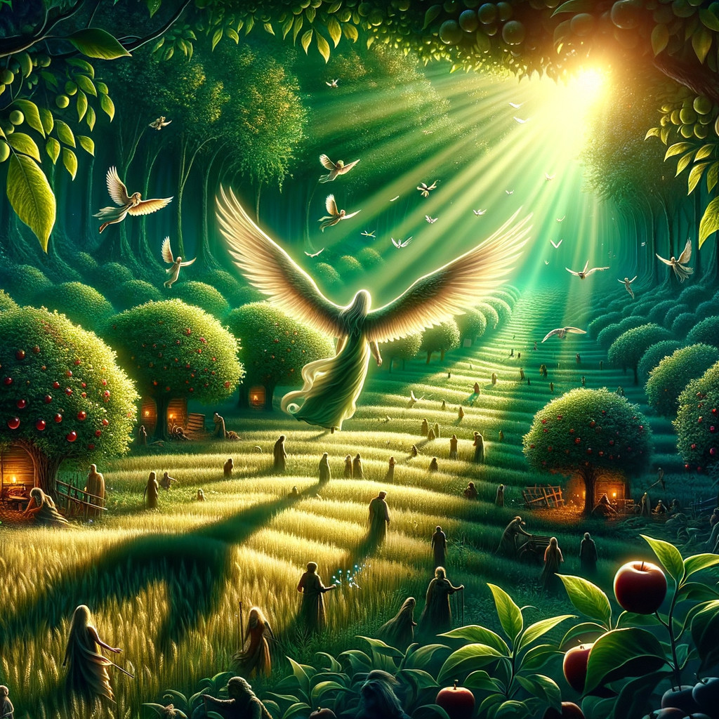 Prompt: poison apples deep in the forest to sunshine on glittering angel wings, peace restored to the village, sunny fields of sweet grass and warm skin.