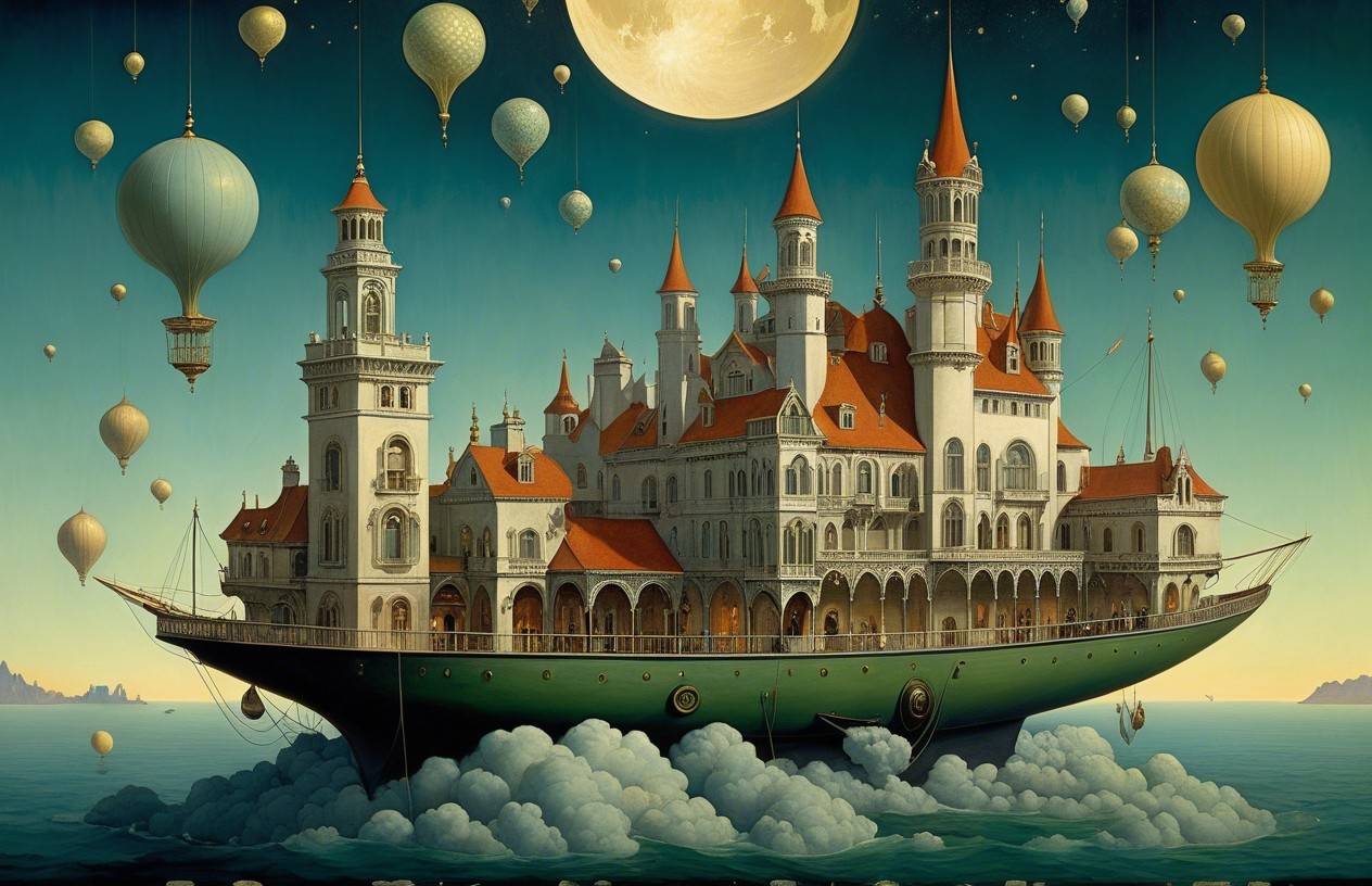 Three elegantly dressed women in ornate gowns sit in a lavish gondola, surrounded by a serene night scene. Glowing lanterns and a large moon illuminate the tranquil waters.