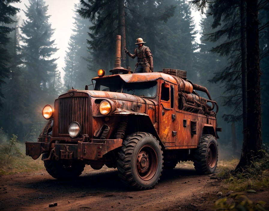 Prompt: "Rusty metal man with thick thread stitches in a rusty funnel cone standing near a rusty burning and broken and armored vehicle, in the forest."