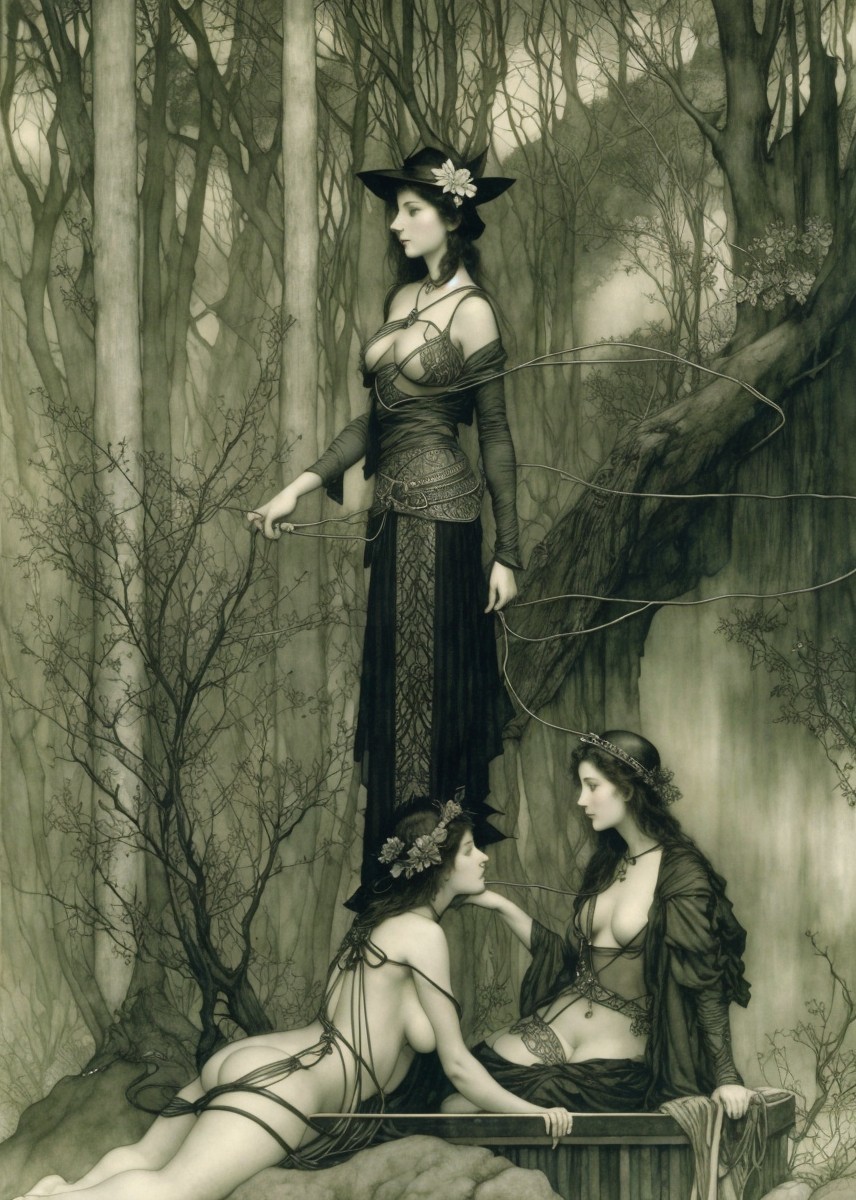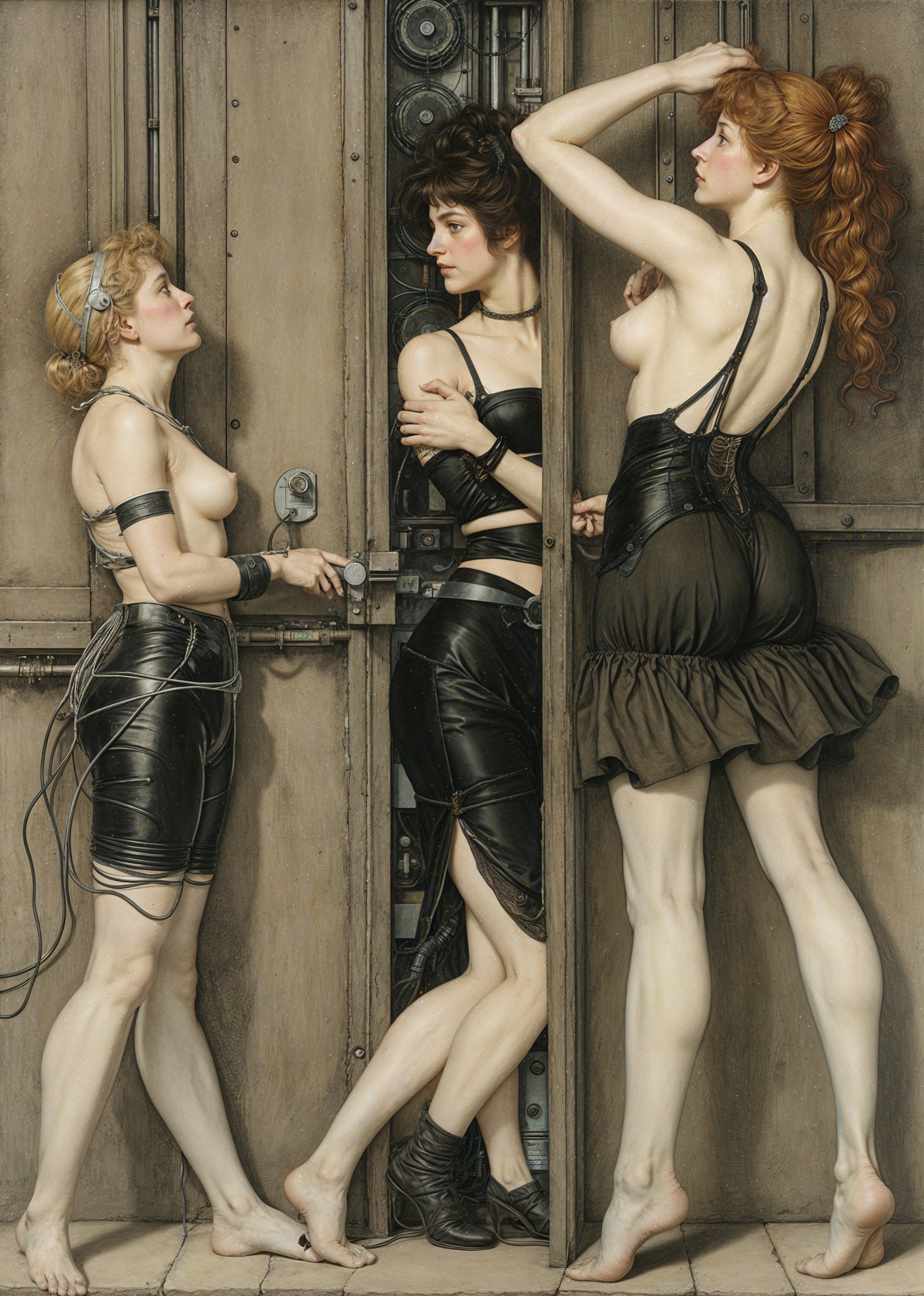 The artwork features two elegantly dressed women with elaborate hairstyles, posed back-to-back beside a vintage mechanical device, showcasing a blend of classic beauty and industrial aesthetics.