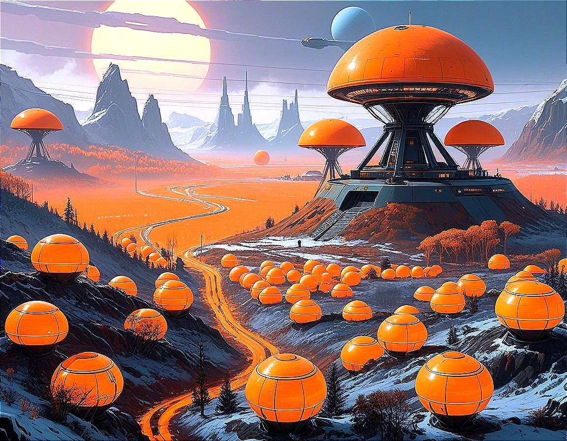 A futuristic landscape with orange domes, a snaking road, and a towering structure under an orange-hued sky with distant spires.