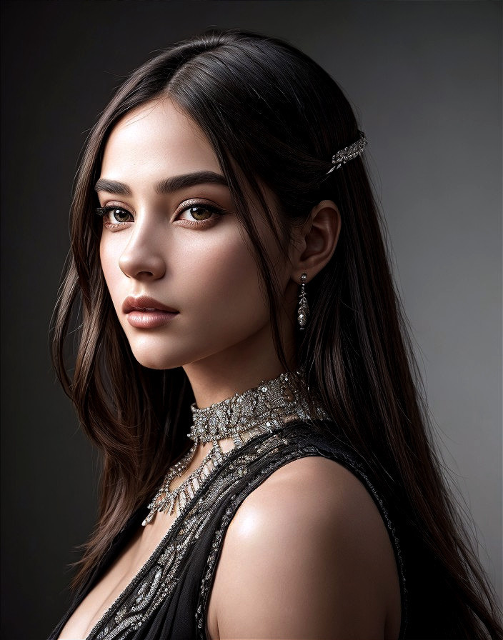 A close-up portrait of a young woman with long, sleek hair adorned with elegant accessories. She wears intricate jewelry and a dark, embellished outfit, exuding sophistication and grace.