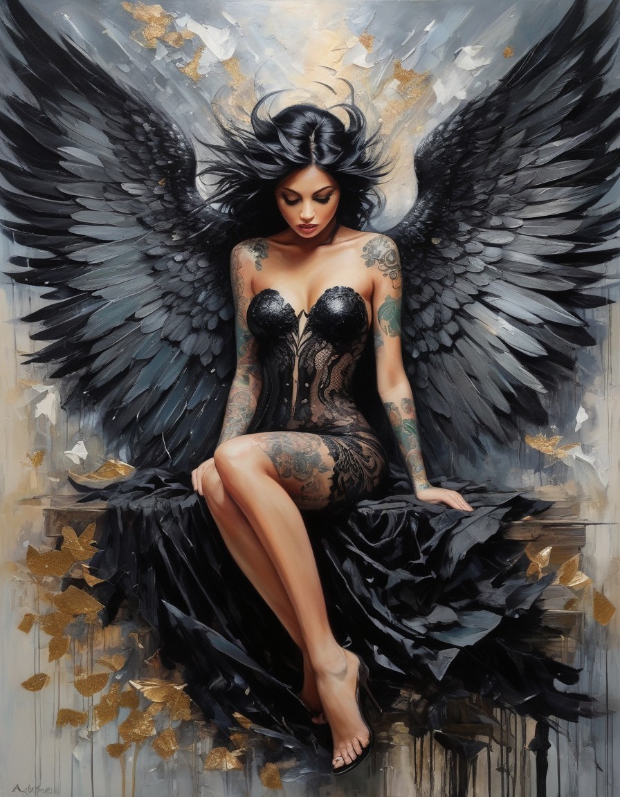 Prompt: "fallen black angel with many tattoos, figurative impressionism, Acrylic on Canvas in the style of Aleksandra Ćaldović, impasto, expressive, muted pallet, by Satori Canton. Angel with shimmering wings art by Florence Harrison, Lillian Bassman, Martin Ansin, Karol Bak, Christian Boltanski, pol Ledent, Jamie Heiden, caia Koopman, Valerie Hegarty, Robert Hagan, Aleksandra Ćaldović, Justin Gaffrey. kneeling. Her body was covered with scales that shimmered like metal, reflecting the light of the dying sun. The scales were hard and smooth, protecting her from the elements and the enemies. They formed patterns and shapes along his limbs and torso, resembling tattoos or armor. The scales were not natural, but a result of her fall from grace. They were a sign of her power, a reminder of her past and her fate