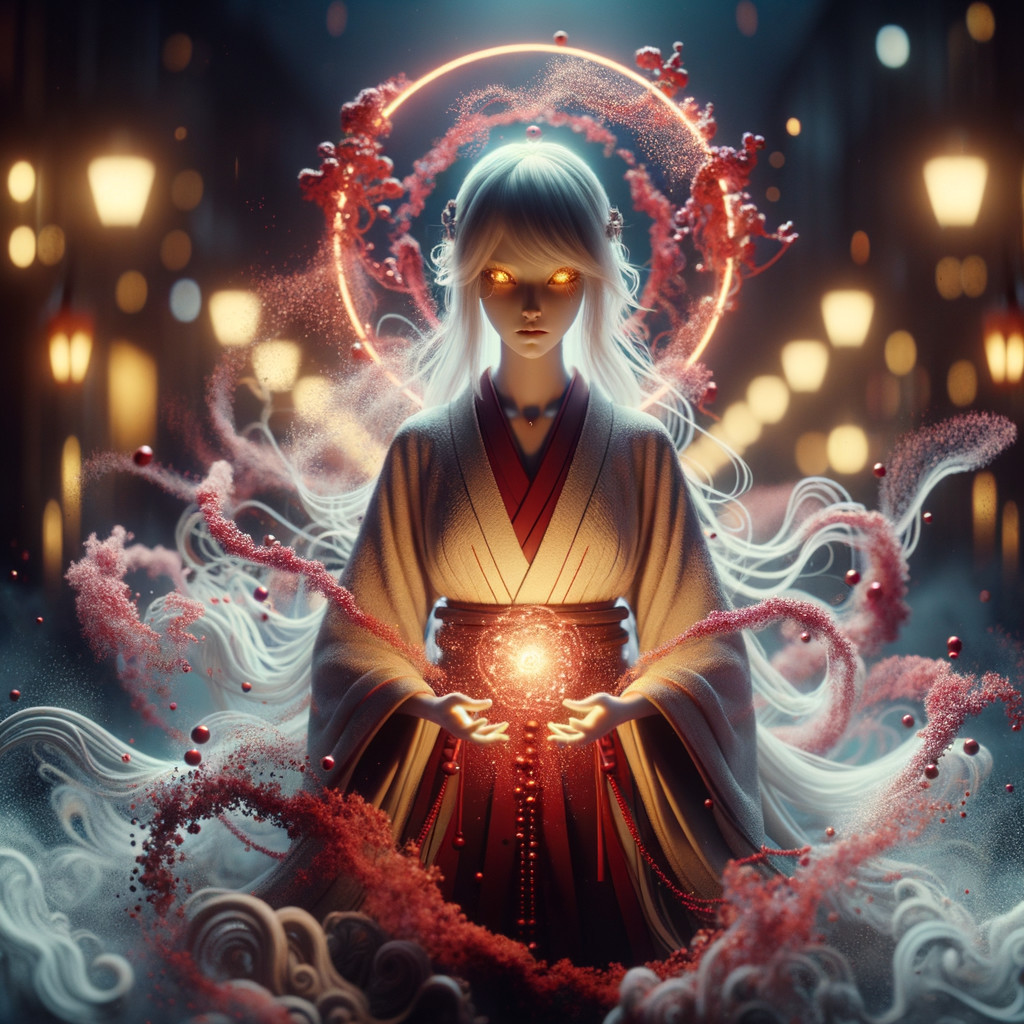 Prompt: eerie night scene, full colour, hyperdetailed, void made human, Aki at 33years old she was the most powerful bloodmancer ever, pale skin, petite build, and white hair, enveloped by a red-halo, dust vapor effect, she was power personified, golden-eyed, summoning blood-magic
