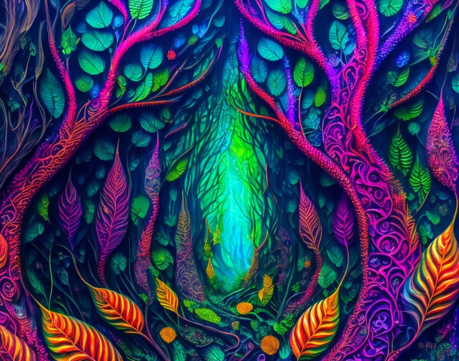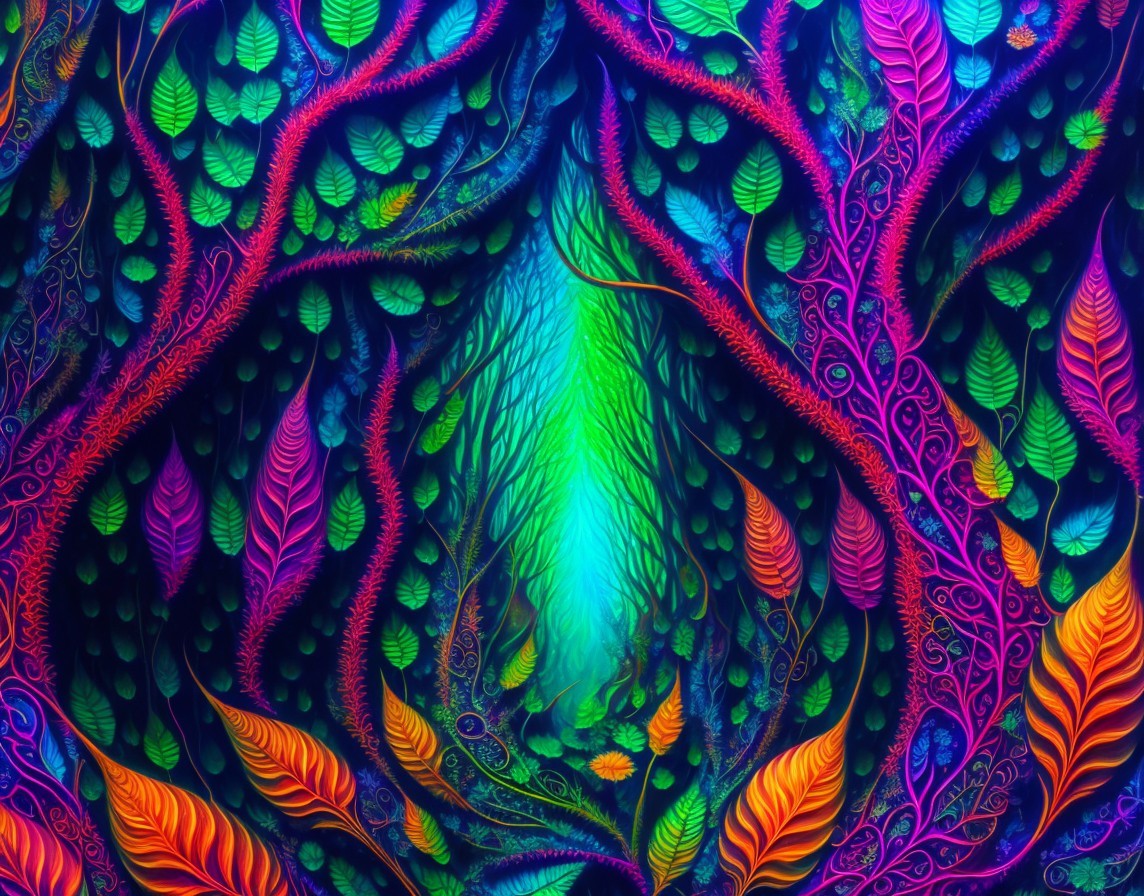 Psychedelic fractal forest with psychedelic leaves detailed and dark spirits dancing around. Aka Tim Burton.
