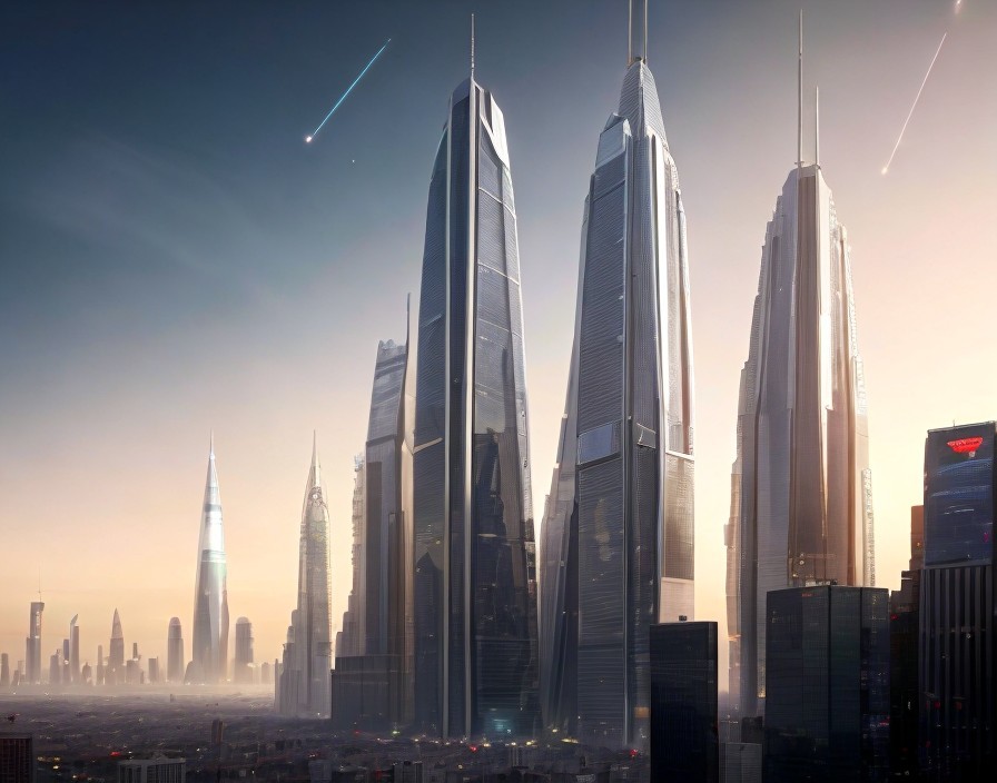 Futuristic cityscape with towering skyscrapers bathed in warm sunlight, reflecting a high-tech urban skyline.