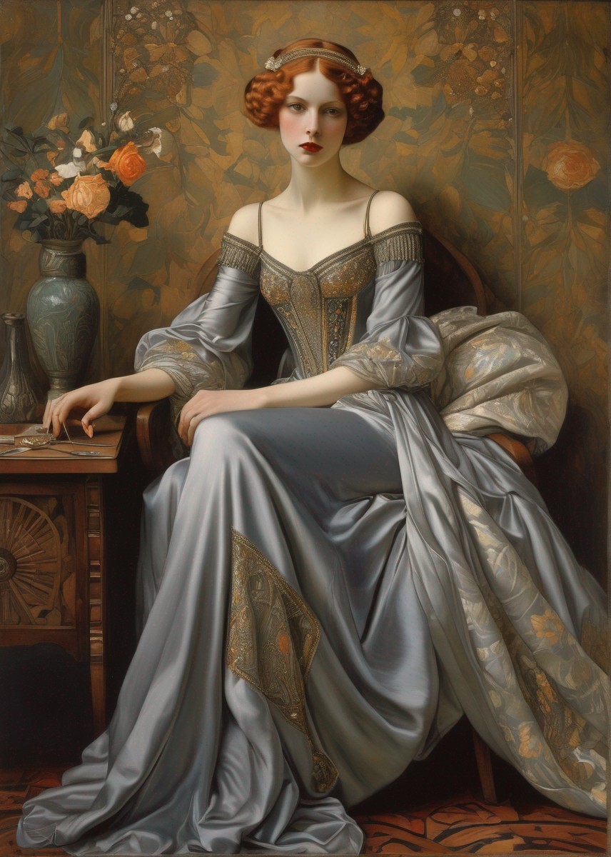 art nouveau style, portrait of a woman, by Tamara de Lempicka & Walter Crane, intricate details, crisp quality,coloured