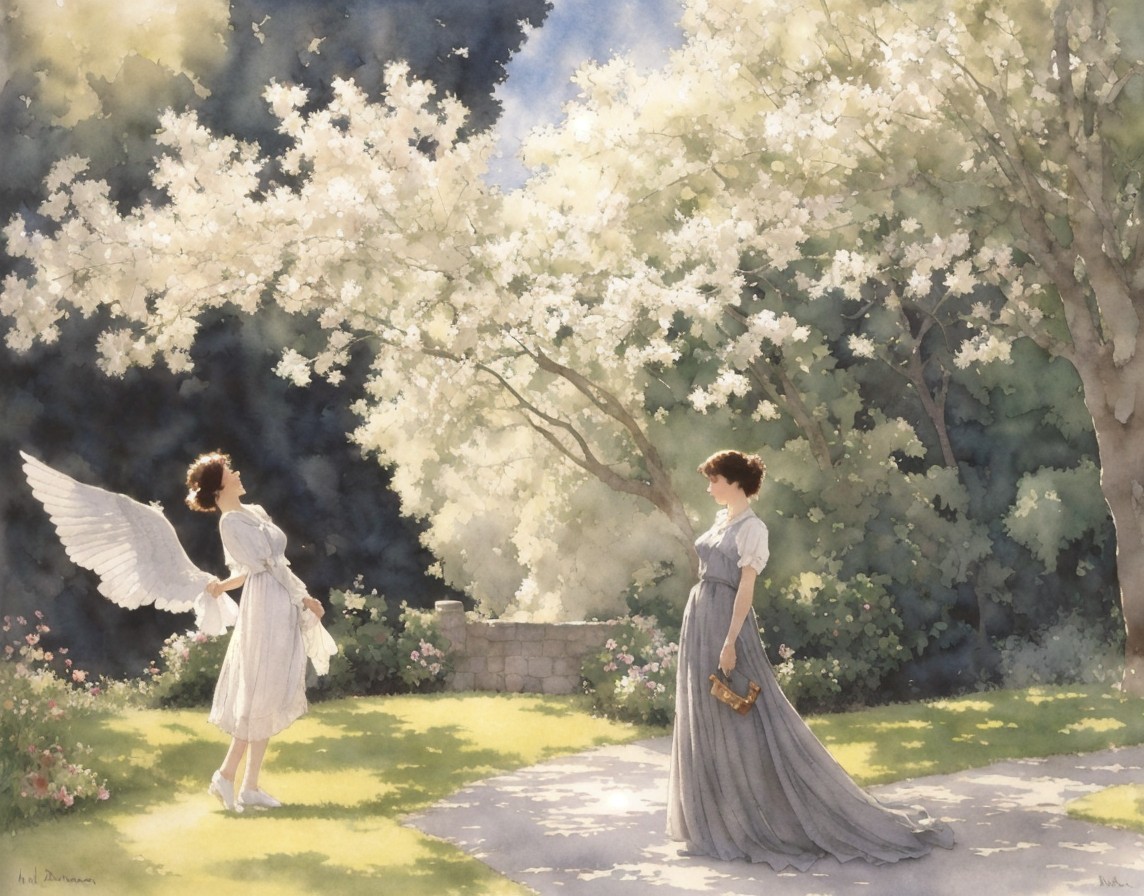 A whimsical watercolor painting of a young girl with curly hair, gazing at the viewer while a dove flies nearby, set against a serene landscape of hills and clouds.