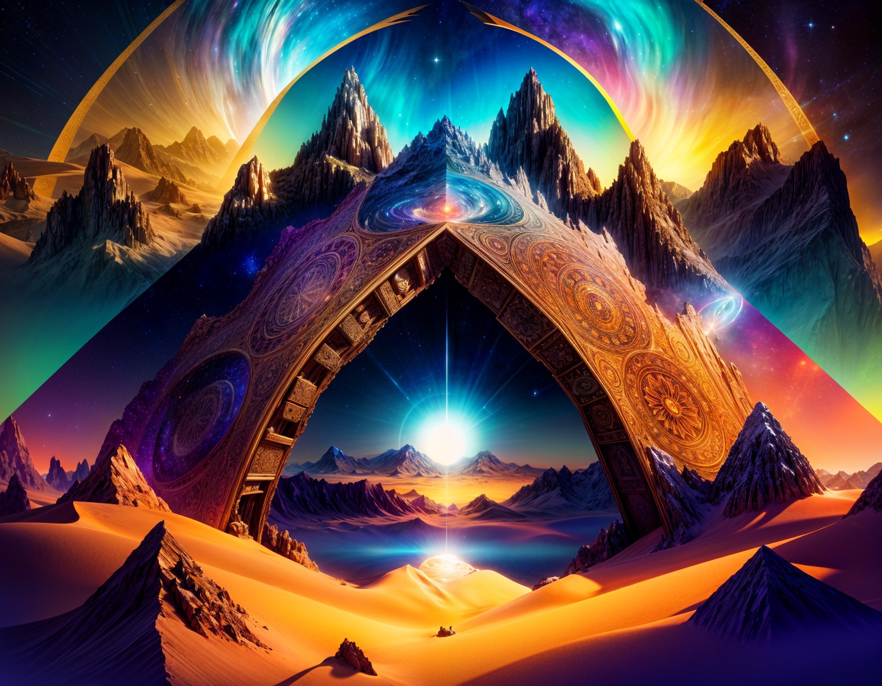 Intricate geometric doorway, all-seeing eye center, mystical symbols, cosmic night sky, nebulae, stars, towering mountains, serene desert foreground, illuminated pool reflection, esoteric, sci-fi, fantasy fusion, ancient wisdom, otherworldly mystery, digital art, highly detailed, surreal landscape, triangles, layers, intricate details, mystical atmosphere, cosmic elements, mystical geometry, vibrant colors, ethereal lighting, mystical ambiance.