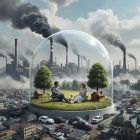In a surreal scene, a family sits in a protective dome, surrounded by lush greenery amidst a polluted industrial landscape, symbolizing hope and isolation from environmental chaos.