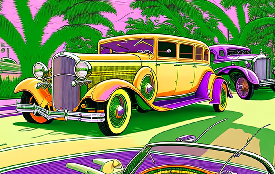 Prompt: A 1930s Buick car drives down the street, by Dan Mumford, correct car construction, orange, purple, purple, pink, green, light green, correct perspective, dirty colors