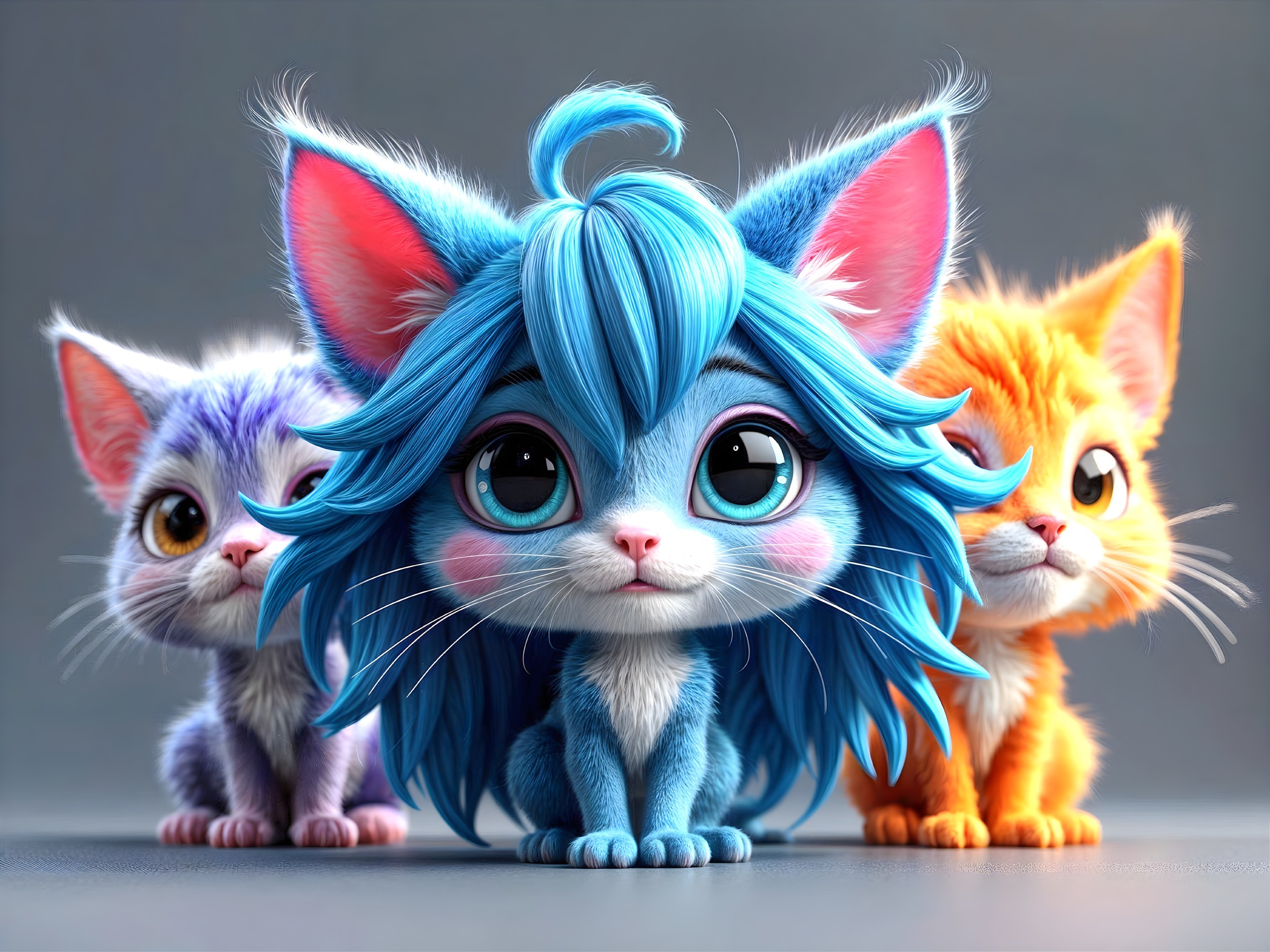 A stunning 3D portrait of young tween cats with blue hair, detailed fur texture, and vibrant colors. The artwork features playful expressions, intricate patterns, and dynamic lighting, creating a whimsical and imaginative design. Created by a skilled artist, the piece showcases hyperrealistic details and crisp quality in an elegant and attractive composition.