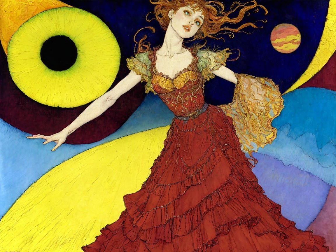 The image features a woman in an elegant, flowing red dress with dramatic sleeves, surrounded by vibrant circles in yellow, black, and blue, conveying a sense of movement and emotion.