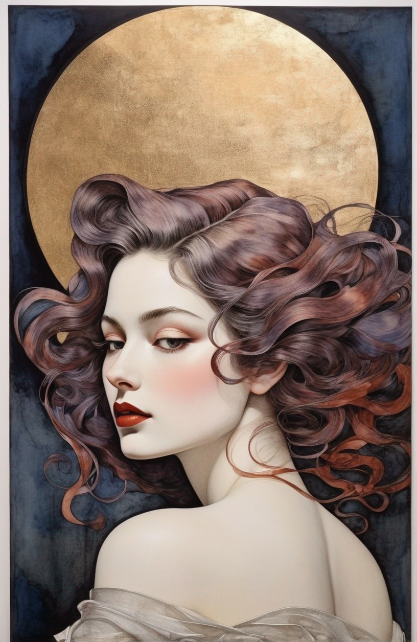 Prompt: Beautiful woman in the style of WALTER MARTIN BAUMHOFER and rené gruauwhimsical, beautiful, poignant, touching. colors rose, gold, rust, indigo, burgundy, black. soft watercolor extra water in Art Deco by Annigoni, Egon Schiele, Milo Manara, Botticelli, Catrin Welz-Stein, Jean Metzinger, Klimt, perfect eyes, perfect hands face , highly detailed, complementary colors, hyper detailed. Watercolor and ink splatter, dynamic pose,