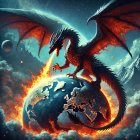 A majestic dragon with fiery scales and intricate wings sits in a vivid landscape of molten lava, surrounded by cosmic planets and stars, creating a stunning, otherworldly scene.