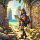 A young girl stands at a vibrant, candy-themed doorway, overlooking a coastal view. Colorful lollipops adorn the entrance, blending fantasy with adventure in a whimsical landscape.