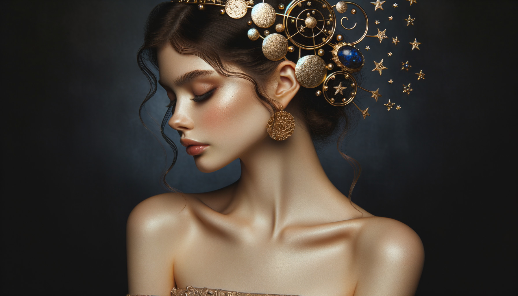 Her ear is adorned with a dangling, textured gold earring, matched by the reflective gold that gently wraps around her body as a strapless dress or ornament, highlighting her collarbones. The background is a deep, star-studded navy blue, suggesting a night sky. Golden accents and swirls fill the space, enhancing the celestial theme.