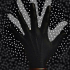 The image features a striking contrast between two hands: one adorned with intricate black henna patterns and an eye motif, while the other is a stark white, set against a polka-dotted background.